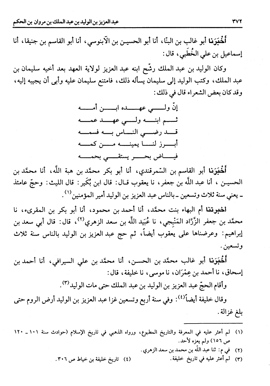 أخبرنا أبو غالب بن البنا أنا أبو الحسين بن الآبنوسي أنا أبو القاسم بن جنيقا أنا إسماعيل بن علي الخطبي قال وكان الوليد بن عبد الملك رشح ابنه عبد العزيز لولاية العهد بعد أخيه سليمان بن عبد الملك وكتب الوليد إلى سليمان يسأله ذلك فامتنع سليمان عليه وأبى أن يجيبه إليه وقد كان بعض الشعراء قال في ذلك * إن ولي عهده ابن أمه * ثم ابنه ولي عهد عمه * قد رضي الناس به فسمه * أبرز لنا يمينه من كمه * فياض بحر يستقى بحمه أخبرنا أبو القاسم بن السمرقندي أنا أبو بكر محمد بن هبة الله أنا محمد بن الحسين أنا عبد الله بن جعفر نا يعقوب قال قال ابن بكير قال الليث وحج عامئذ يعني سنة ثلاث وتسعين بالناس عبد العزيز بن الوليد أمير المؤمنين (1) أخبرتنا أم البهاء بنت محمد أنا أحمد بن محمود أنا أبو بكر بن المقرئ نا محمد بن جعفر الزراد المنبجي نا عبيد الله بن سعد الزهري (2) قال قال أبي سعد بن إبراهيم وعرضناها على يعقوب أيضا ثم حج عبد العزيز بن الوليد بالناس سنة ثلاث وتسعين أخبرنا أبو غالب محمد بن الحسن أنا محمد بن علي السيرافي أنا أحمد بن إسحاق نا أحمد بن عمران نا موسى نا خليفة قال وأقام الحج عبد العزيز بن الوليد بن عبد الملك حتى مات الوليد (3) وقال خليفة أيضا (4) وفى سنة أربع وتسعين غزا عبد العزيز بن الوليد أرض الروم حتى بلغ غزالة
