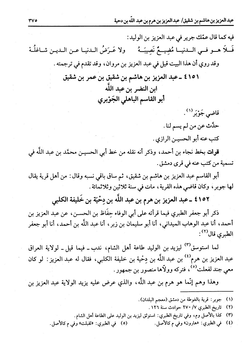 4152 - عبد العزيز بن هرم بن عبد الله بن دحية بن خليفة الكلبي ذكر أبو جعفر الطبري فيما قرأته على أبي الوفاء حفاظ بن الحسن عن عبد العزيز بن أحمد أنا عبد الوهاب الميداني أنا أبو سليمان بن زبر أنا عبد الله بن أحمد أنا أبو جعفر الطبري قال (2) لما استوسق (3) ليزيد بن الوليد طاعة أهل الشام ندب فيما قيل لولاية العراق عبد العزيز بن هرم (4) بن عبد الله بن دحية بن خليفة الكلبي فقال له عبد العزيز لو كان معي جند لفعلت (5) فتركه وولاها منصور بن جمهور وهذا وهم إنما هو هرم بن عبد الله والذي عرض عليه يزيد الولاية عبد العزيز بن