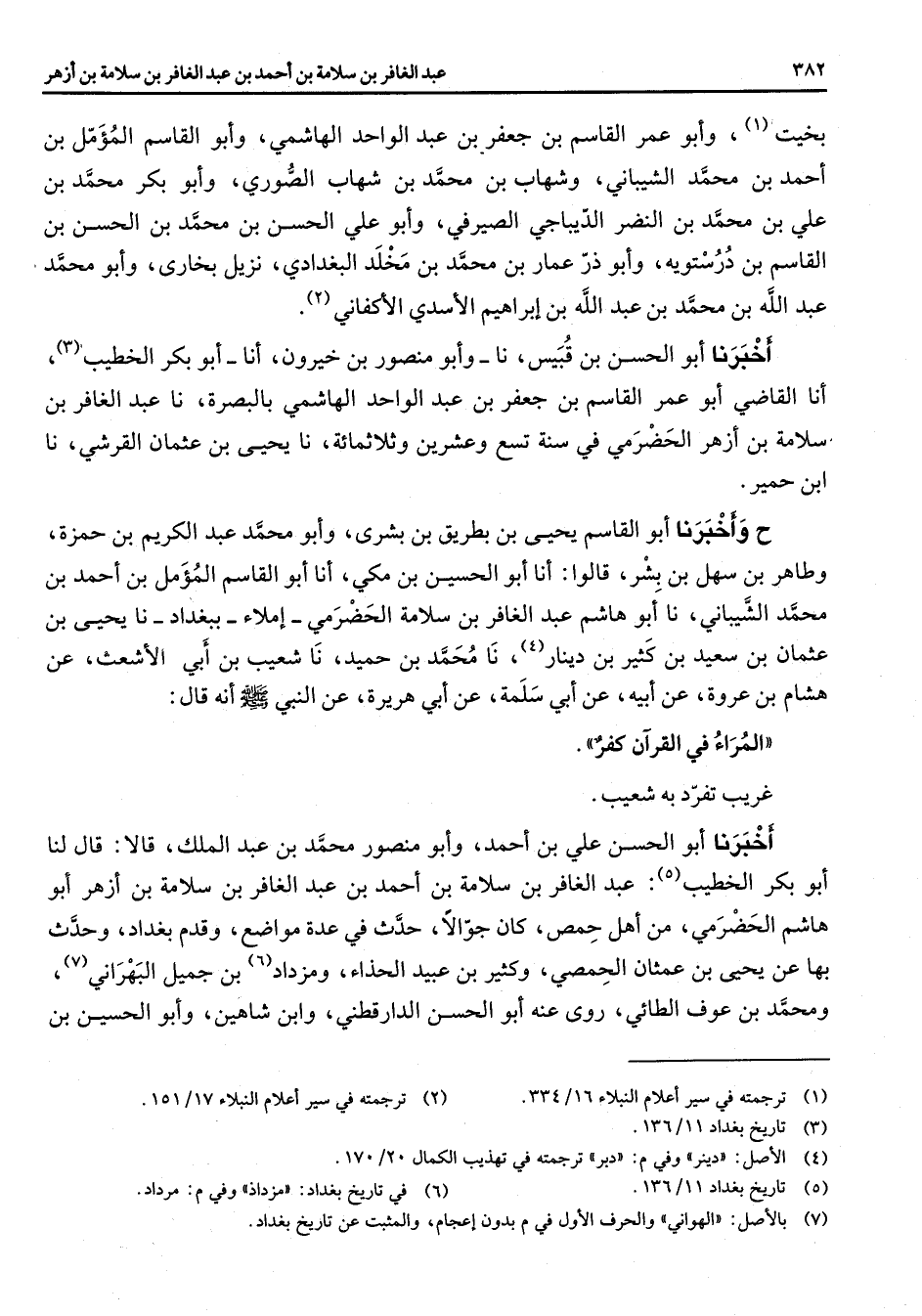 بخيت (1) وأبو عمر القاسم بن جعفر بن عبد الواحد الهاشمي وأبو القاسم المؤمل بن أحمد بن محمد الشيباني وشهاب بن محمد بن شهاب الصوري وأبو بكر محمد بن علي بن محمد بن النضر الديباجي الصيرفي وأبو علي الحسن بن محمد بن الحسن بن القاسم بن درستوية وأبو ذر عمار بن محمد بن مخلد البغدادي نزيل بخارى وأبو محمد عبد الله بن محمد بن عبد الله بن إبراهيم الأسدي الأكفاني (2) أخبرنا أبو الحسن بن قبيس نا وأبو منصور بن خيرون أنا أبو بكر الخطيب (3) أنا القاضي أبو عمر القاسم بن جعفر بن عبد الواحد الهاشمي بالبصرة نا عبد الغافر بن سلامة بن أزهر الحضرمي في سنة تسع وعشرين وثلاثمائة نا يحيى بن عثمان القرشي نا ابن حمير ح وأخبرنا أبو القاسم يحيى بن بطريق بن بشرى وأبو محمد عبد الكريم بن حمزة وطاهر بن سهل بن بشر قالوا أنا أبو الحسين بن مكي أنا أبو القاسم المؤمل بن أحمد بن محمد الشيباني نا أبو هاشم عبد الغافر بن سلامة الحضرمي إملاء ببغداد نا يحيى بن عثمان بن سعيد بن كثير بن دينار (4) نا محمد بن حميد نا شعيب بن أبي الأشعث عن هشام بن عروة عن أبيه عن أبي سلمة عن أبي هريرة عن النبي (صلى الله عليه وسلم) أنه قال المراء في القرآن كفر " غريب تفرد به شعيب أخبرنا أبو الحسن علي بن أحمد وأبو منصور محمد بن عبد الملك قالا قال لنا أبو بكر الخطيب (5) عبد الغافر بن سلامة بن أحمد بن عبد الغافر بن سلامة بن أزهر أبو هاشم الحضرمي من أهل حمص كان جوالا حدث في عدة مواضع وقدم بغداد وحدث بها عن يحيى بن عثمان الحمصي وكثير بن عبيد الحذاء ومزداد (6) بن جميل البهراني (7) ومحمد بن عوف الطائي روى عنه أبو الحسن الدارقطني وابن شاهين وأبو الحسين بن