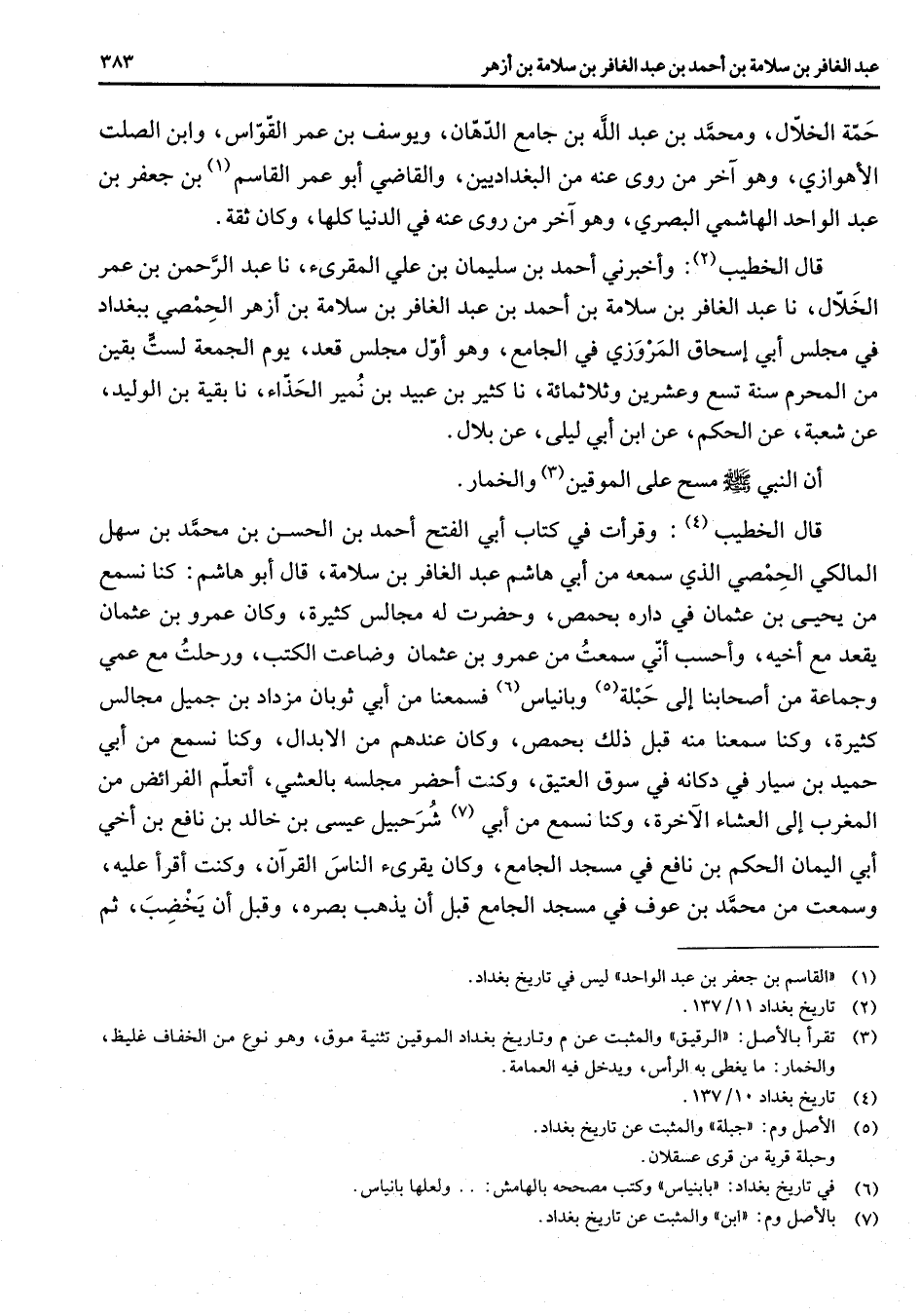 حمة الخلال ومحمد بن عبد الله بن جامع الدهان ويوسف بن عمر القواس وابن الصلت الأهوازي وهو آخر من روى عنه من البغداديين والقاضي أبو عمر القاسم (1) بن جعفر بن عبد الواحد الهاشمي البصري وهو آخر من روى عنه في الدنيا كلها وكان ثقة قال الخطيب (2) وأخبرني أحمد بن سليمان بن علي المقرئ نا عبد الرحمن بن عمر الخلال نا عبد الغافر بن سلامة بن أحمد بن عبد الغافر بن سلامة بن أزهر الحمصي ببغداد في مجلس أبي إسحاق المروزي في الجامع وهو أول مجلس قعد يوم الجمعة لست بقين من المحرم سنة تسع وعشرين وثلاثمائة نا كثير بن عبيد بن نمير الحذاء نا بقية بن الوليد عن شعبة عن الحكم عن ابن أبي ليلى عن بلال أن النبي (صلى الله عليه وسلم) مسح على الموقين (3) والخمار قال الخطيب (4) وقرأت في كتاب أبي الفتح أحمد بن الحسن بن محمد بن سهل المالكي الحمصي الذي سمعه من أبي هاشم عبد الغافر بن سلامة قال أبو هاشم كنا نسمع من يحيى بن عثمان في داره بحمص وحضرت له مجالس كثيرة وكان عمرو بن عثمان يقعد مع أخيه وأحسب أني سمعت من عمرو بن عثمان وضاعت الكتب ورحلت مع عمي وجماعة من أصحابنا إلى حبلة (5) وبانياس (6) فسمعنا من أبي ثوبان مزداد بن جميل مجالس كثيرة وكنا سمعنا منه قبل ذلك بحمص وكان عندهم من الابدال وكنا نسمع من أبي حميد بن سيار في دكانه في سوق العتيق وكنت أحضر مجلسه بالعشي أتعلم الفرائض من المغرب إلى العشاء الآخرة وكنا نسمع من أبي (7) شرحبيل عيسى بن خالد بن نافع بن أخي أبي اليمان الحكم بن نافع في مسجد الجامع وكان يقرئ الناس القرآن وكنت أقرأ عليه وسمعت من محمد بن عوف في مسجد الجامع قبل أن يذهب بصره وقبل أن يخضب ثم خضب وقدح فأبصر أياما ثم