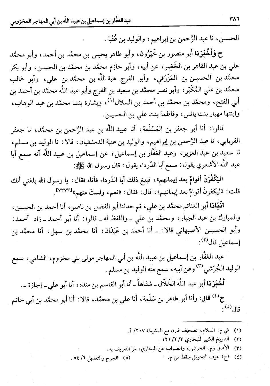 [7373] أنبانا أبو الغنائم محمد بن علي ثم حدثنا أبو الفضل بن ناصر انا أحمد بن الحسن والمبارك بن عبد الجبار ومحمد بن علي واللفظ له قالوا أنا أبو أحمد زاد أحمد وأبو الحسين الأصبهاني قالا أنا أحمد بن عبدان أنا محمد بن سهل أنا محمد بن إسماعيل قال (2) وعبد الغفار بن إسماعيل بن عبيد الله بن أبي المهاجر مولى بني مخزوم الشامي سمع الوليد الجرشي (3) وعن أبيه سمع منه الوليد بن مسلم أخبرنا أبو عبد الله الخلال شفاها أنا أبو القاسم بن منده أنا أبو علي إجازه ح (4) قال وأنا أبو طاهر بن سلمة أنا علي بن محمد قالا أنا أبو محمد بن أبي حاتم قال (5)