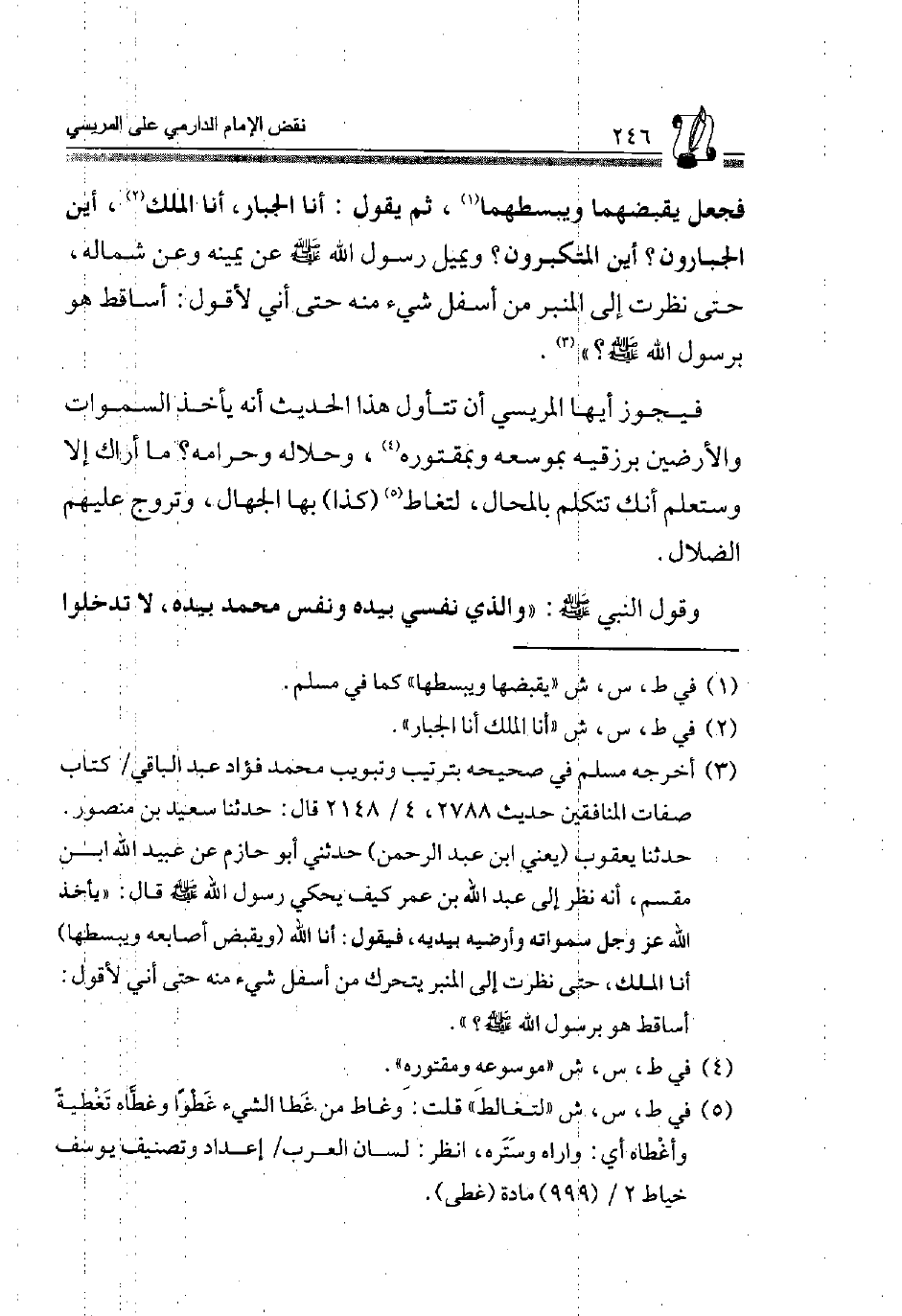 فَيَجُوزُ أَيُّهَا الْمَرِيسِيُّ أَنْ تَتَأَوَّلَ هَذَا الْحَدِيثَ أَنَّهُ يَأْخُذُ السَّمَوَاتِ وَالْأَرَضِينَ بِرِزْقَيْهِ بِمُوَسَّعِهِ، وَبِمَقْتُورِهِ4 وَحَلَالِهِ وَحَرَامِهِ؟ مَا أَرَاكَ إِلَّا وَسَتَعْلَمُ أَنَّكَ تَتَكَلَّمُ بِالْمُحَالِ، لِتُغَاطَ5 "كَذَا" بِهَا الْجُهَّالَ، وَتُرَوِّجَ عَلَيْهِمُ الضَّلَالَ.