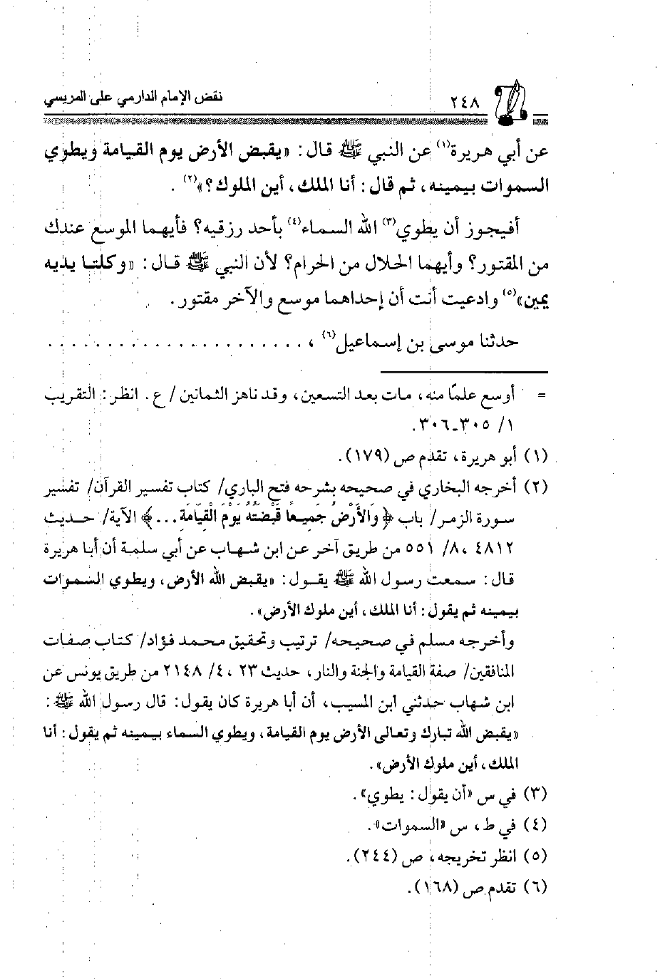 عَنْ أَبِي هُرَيْرَةَ1، عَنِ النَّبِيِّ صَلَّى اللَّهُ عَلَيْهِ وَسَلَّمَ قَالَ: "يَقْبِضُ الْأَرْضَ يَوْمَ الْقِيَامَةِ وَيَطْوِي السَّمَوَاتِ بِيَمِينِهِ، ثُمَّ قَالَ: أَنَا الْمَلِكُ، أَيْنَ الْمُلُوكُ؟ " 2.