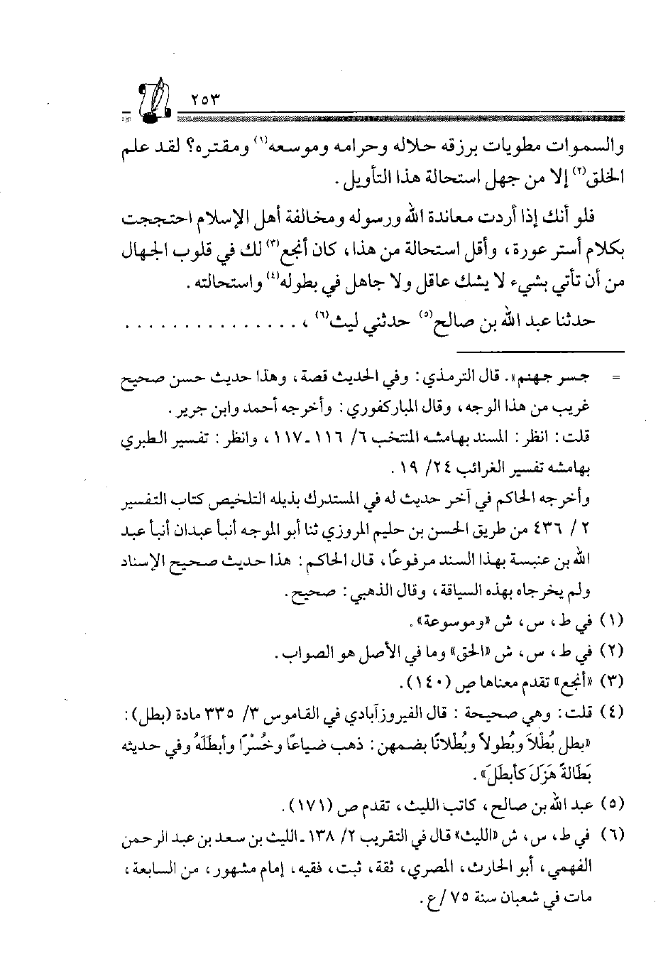 = جسر جَهَنَّم". قَالَ التِّرْمِذِيّ: وَفِي الحَدِيث قصَّة، وَهَذَا حَدِيث حسن صَحِيح غَرِيب من هَذَا الْوَجْه، وَقَالَ المباركفوري: وَأخرجه أَحْمد وَابْن جرير.
