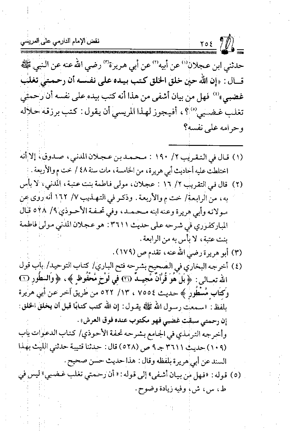 حَدَّثَنِي ابْنُ عَجْلَانَ1، عَنْ أَبِيهِ2، عَنْ أَبِي هُرَيْرَةَ3 رَضِيَ اللَّهُ عَنْهُ، عَنِ النَّبِيِّ صَلَّى اللَّهُ عَلَيْهِ وَسَلَّمَ قَالَ: "إِنَّ اللَّهَ حِينَ خَلَقَ الْخَلْقَ كَتَبَ بِيَدِهِ عَلَى نَفْسِهِ إِنَّ رَحْمَتِي تَغْلِبُ غَضَبِي" 4 فَهَلْ مِنْ بَيَانٍ أَشْفَى مِنْ هَذَا أَنَّهُ كَتَبَ بِيَدِهِ عَلَى نَفْسِهِ إِنَّ رَحْمَتِي تَغْلِبُ غَضَبِي5؟ أَفَيَجُوزُ لِهَذَا الْمَرِيسِيِّ أَنْ يَقُولَ: كَتَبَ بِرِزْقِهِ حَلَالِهِ وَحَرَامِهِ على نَفسه؟