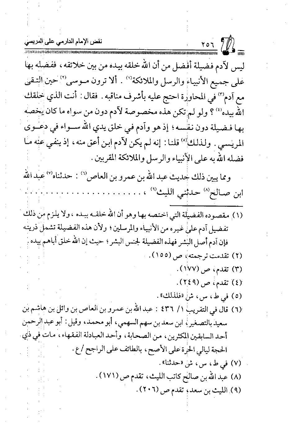 لَيْسَ لآدَم أفضل من أَن الله بِيَدِهِ وَمن بَيْنِ خَلَائِقِهِ، فَفَضَّلَهُ بِهَا عَلَى جَمِيعِ الْأَنْبِيَاءِ وَالرُّسُلِ وَالْمَلَائِكَةِ1 أَلَا تَرَوْنَ مُوسَى2 حِينَ الْتَقَى مَعَ آدَمَ3 فِي الْمُحَاوَرَةِ احْتَجَّ عَلَيْهِ بِأَشْرَفِ مَنَاقِبِهِ فَقَالَ: أَنْتَ الَّذِي خَلَقَكَ اللَّهُ بِيَدِهِ4؟ وَلَوْ لَمْ تَكُنْ هَذِهِ مَخْصُوصَةً لِآدَمَ دُونَ من سوه مَا كَانَ يَخُصُّهُ بِهَا فَضِيلَةً دُونَ نَفْسِهِ، إِذْ هُوَ وَآدَمُ فِي خَلْقِ يَدَيِ اللَّهِ سَوَاءٌ فِي دَعْوَى الْمَرِيسِيِّ وَلِذَلِكَ5 قُلْنَا إِنَّهُ لَمْ يَكُنْ لِآدَمَ ابْنٌ أَعَقُّ مِنْهُ، إِذْ يَنْفِي عَنْهُ مَا فَضَّلَهُ اللَّهُ بِهِ عَلَى الْأَنْبِيَاءِ وَالرُّسُلِ وَالْمَلَائِكَةِ الْمُقَرَّبِينَ.
