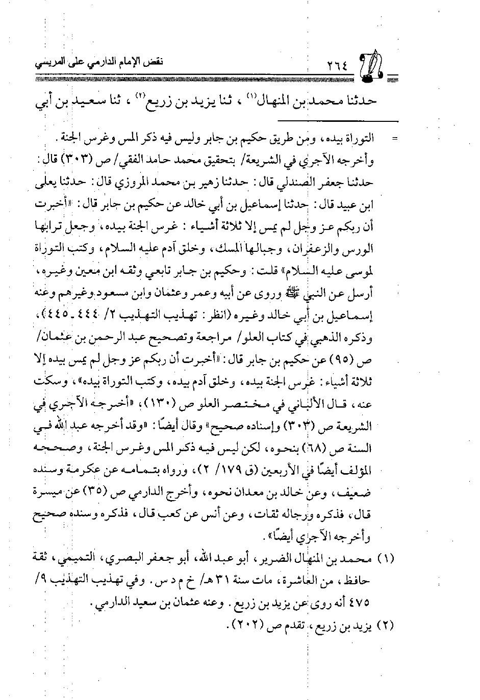 1 مُحَمَّد بن الْمنْهَال الضَّرِير، أَبُو عبد الله، أَبُو جَعْفَر الْبَصْرِيّ، والتميمي ثِقَة 475 أَنه روى عَن يزِيد بن زُرَيْع، وَعنهُ عُثْمَان بن سعيد الدَّارمِيّ.