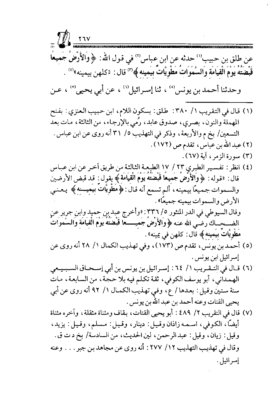 عَنْ طَلْقِ بْنِ حَبِيبٍ1 حَدَّثَهُ عَنِ ابْنِ عَبَّاسٍ2 فِي قَوْلِ اللَّهِ {وَالْأَرْضُ جَمِيعاً قَبْضَتُهُ يَوْمَ الْقِيَامَةِ وَالسَّمَاوَاتُ مَطْوِيَّاتٌ بِيَمِينِهِ} 3 قَالَ: "كُلهنَّ بِيَمِينِهِ"4.