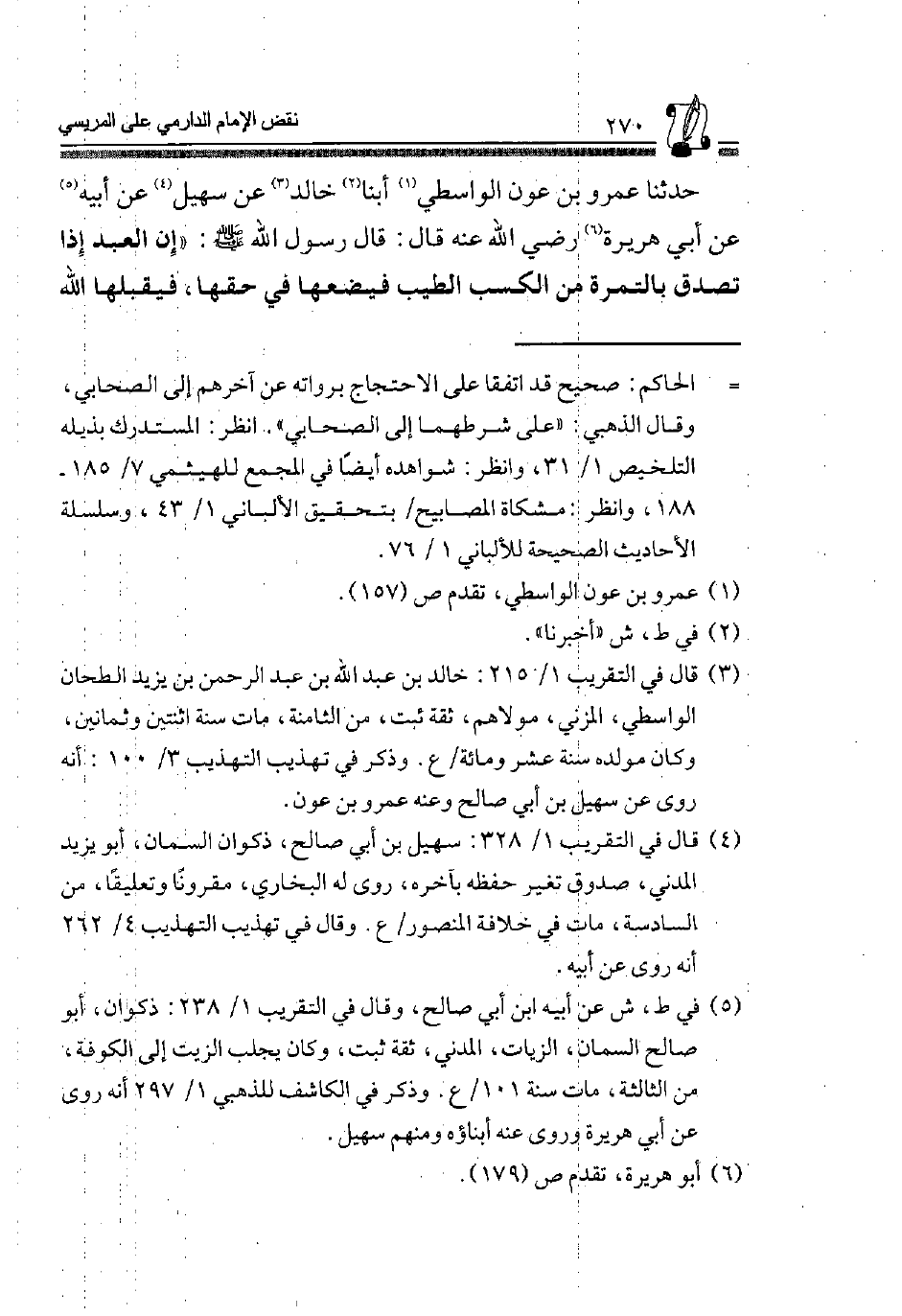 حَدَّثَنَا عَمْرُو بْنُ عَوْنٍ الْوَاسِطِيُّ1 أبنا2 خَالِدٌ3، عَنْ سُهَيْلٍ4، عَنْ أَبِيهِ5، عَنْ أَبِي هُرَيْرَةَ6 رَضِيَ اللَّهُ عَنْهُ قَالَ: قَالَ رَسُولُ اللَّهِ -صَلَّى اللَّهُ عَلَيْهِ وَسَلَّمَ: "إِنَّ العَبْد إِذْ 1 تَصَدَّقَ بِالتَّمْرَةِ مِنَ الْكَسْبِ الطَّيِّبِ فَيَضَعُهَا فِي حَقِّهَا، فَيَقْبَلُهَا اللَّهُ
