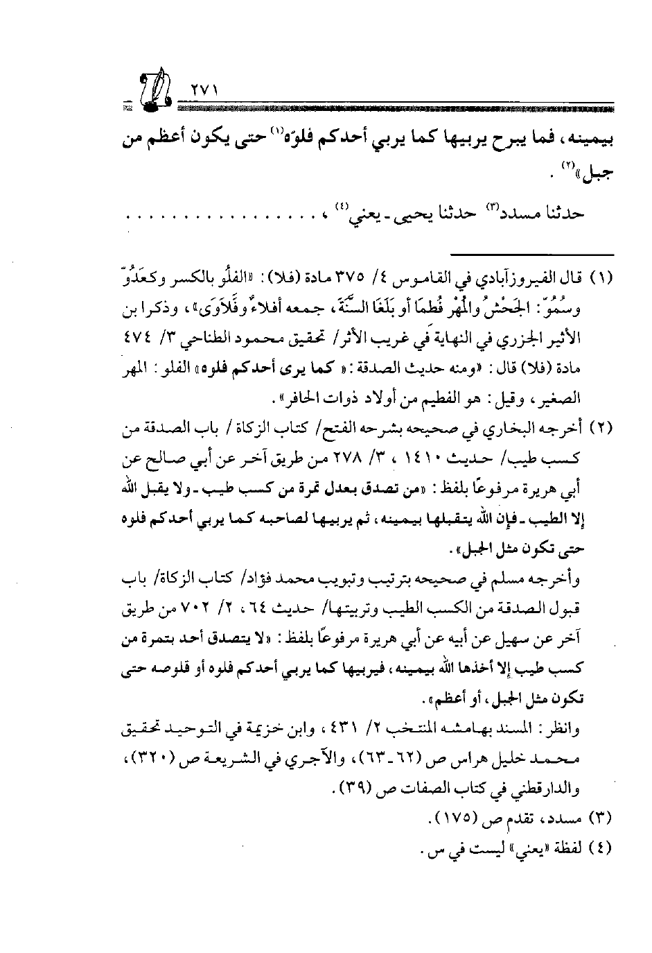 2 أخرجه البُخَارِيّ فِي صَحِيحه بشرحه الْفَتْح، كتاب الزَّكَاة، بَاب الصَّدَقَة من كسب طيب، حَدِيث 1410، 3/ 278 من طَرِيق آخر عَنْ أَبِي صَالِحٍ عَنْ أَبِي هُرَيْرَة مَرْفُوعا بِلَفْظ: "من تصدق بِعدْل تَمْرَة من كسب طيب -وَلَا يقبل الله إِلَّا الطّيب- فَإِن الله يتقبلها بِيَمِينِهِ، ثمَّ يُرَبِّيهَا لصالحه كَمَا يُربي أحدكُم فلوه مَتى تكون مثل الْجَبَل".