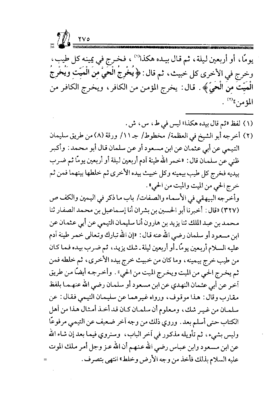 2 أخرجه أَبُو الشَّيْخ فِي العظمة، مخطوط، جـ11/ ورقة "8" من طَرِيق سُلَيْمَان التَّيْمِيّ عَن أبي عُثْمَان، عَن ابْن مَسْعُود أَو عَن سلمَان قَالَ أَبُو مُحَمَّد: وأكبر ظَنِّي عَن سلمَان قَالَ: "خمر الله طِينَة آدم أَرْبَعِينَ لَيْلَة أَو أَرْبَعِينَ يَوْمًا ثمَّ ضرب بيدَيْهِ فَخَرَجَ كُلُّ طَيِّبٍ بَيَمِينِهِ وَكُلُّ خَبِيث بِيَدِهِ الْأُخْرَى ثمَّ خلطها بَينهمَا فَمن ثمَّ خرج الْحَيّ من الْمَيِّت وَالْمَيِّت من الْحَيّ".