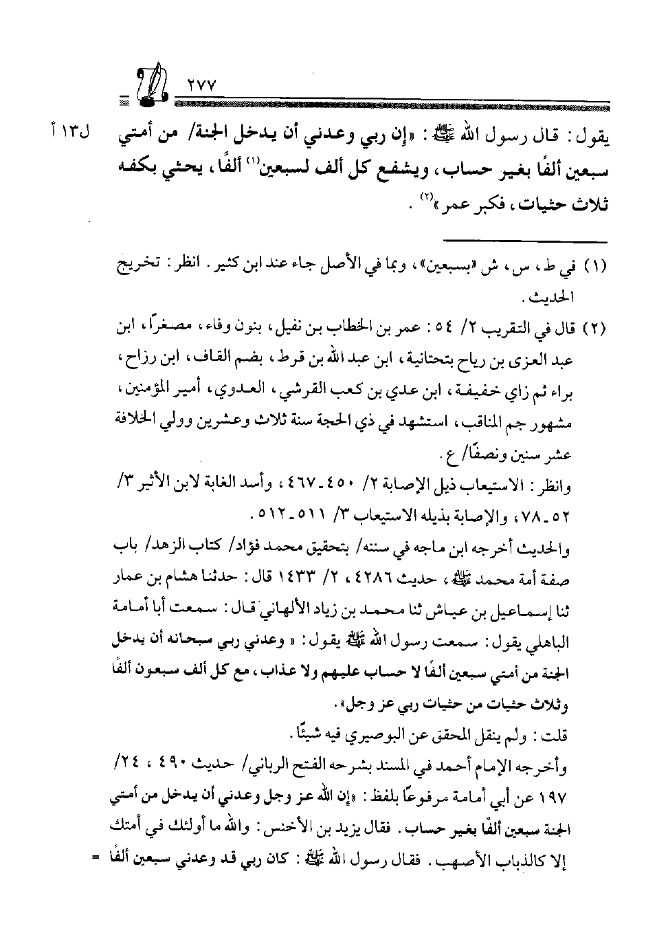 والْحَدِيث أخرجه ابْن مَاجَه فِي سنَنه، بتحقيق مُحَمَّد فؤاد، كتاب الزّهْد، بَاب صفة أُمَّةَ مُحَمَّدٍ صَلَّى اللَّهُ عَلَيْهِ وَسلم، حَدِيث 4286، 2/ 1433، قَالَ: حَدثنَا هِشَام بن عمار، ثَنَا إِسْمَاعِيل بن عَيَّاش، ثَنَا مُحَمَّد بن زِيَادَة الْأَلْهَانِي قَالَ: سَمِعت أَبَا أُمَامَة الْبَاهِلِيّ يَقُولُ: سَمِعْتُ رَسُولَ اللَّهِ صَلَّى الله عَلَيْهِ وَسلم يَقُول: "وَعَدَني رَبِّي سُبْحَانَهُ أَنْ يُدْخِلَ الْجَنَّةَ مِنْ أُمَّتِي سبعين ألفا لَا حِسَاب عَلَيْهِم وَلَا عَذَاب، مَعَ كل ألف سَبْعُونَ ألفا وَثَلَاث حثيات من حثيات رَبِّي عز وَجل".
