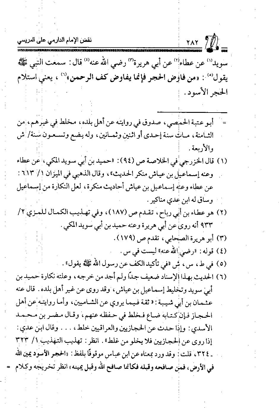 سُوَيْدٍ1، عَنْ عَطَاءٍ2، عَنْ أَبِي هُرَيْرَةَ3 رَضِيَ اللَّهُ عَنْهُ4 قَالَ: سَمِعْتُ النَّبِيَّ صَلَّى اللَّهُ عَلَيْهِ وَسَلَّمَ يَقُولُ5: "مَنْ فَاوَضَ الْحَجَرَ فَإِنَّمَا يُفَاوِضُ كَفَّ الرَّحْمَنِ" 6 يَعْنِي استلام الْحجر الْأسود.