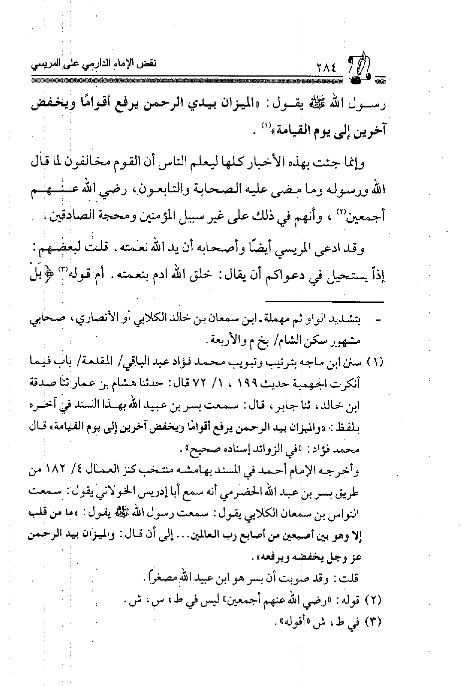 1 سنَن ابْن مَاجَه بترتيب وتبويب مُحَمَّد فؤاد عبد الْبَاقِي، الْمُقدمَة، بَاب أنْكرت الْجَهْمِية حَدِيث 199، 1/ 72 قَالَ: حَدثنَا هِشَام بن عمار، ثَنَا صَدَقَة بن خَالِد، ثَنَا جَابر قَالَ: سَمِعت بسر بن عبيد الله بِهَذَا السَّنَد فِي آخِره بِلَفْظ: "وَالْمِيزَان بيد الرَّحْمَنِ يَرْفَعُ أَقْوَامًا وَيُخْفِضُ آخَرِينَ إِلَى يَوْم الْقِيَامَة" قَالَ مُحَمَّد فؤاد: "فِي الزَّوَائِد إِسْنَاده صَحِيح".