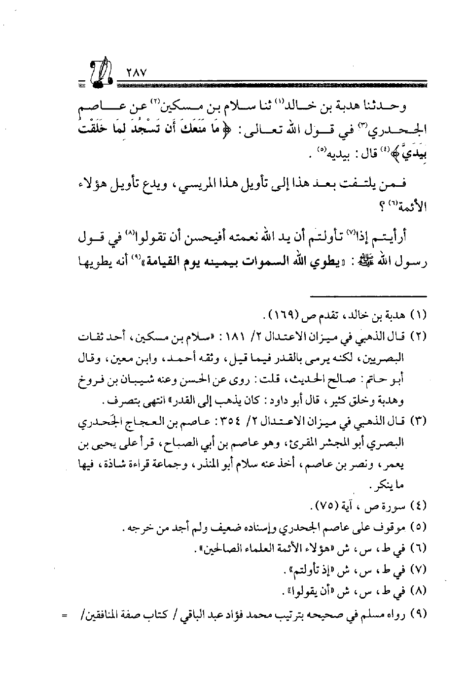 وَحدثنَا هدبة بن خَالِد1، ثَنَا سَلَّامُ بْنُ مِسْكِينٍ2، عَنْ عَاصِمٍ الْجَحْدَرِيِّ3 فِي قَوْلِ اللَّهِ تَعَالَى: {مَا مَنَعَكَ أَنْ تَسْجُدَ لِمَا خَلَقْتُ بِيَدَيَّ} 4 قَالَ: بِيَدَيْهِ5.