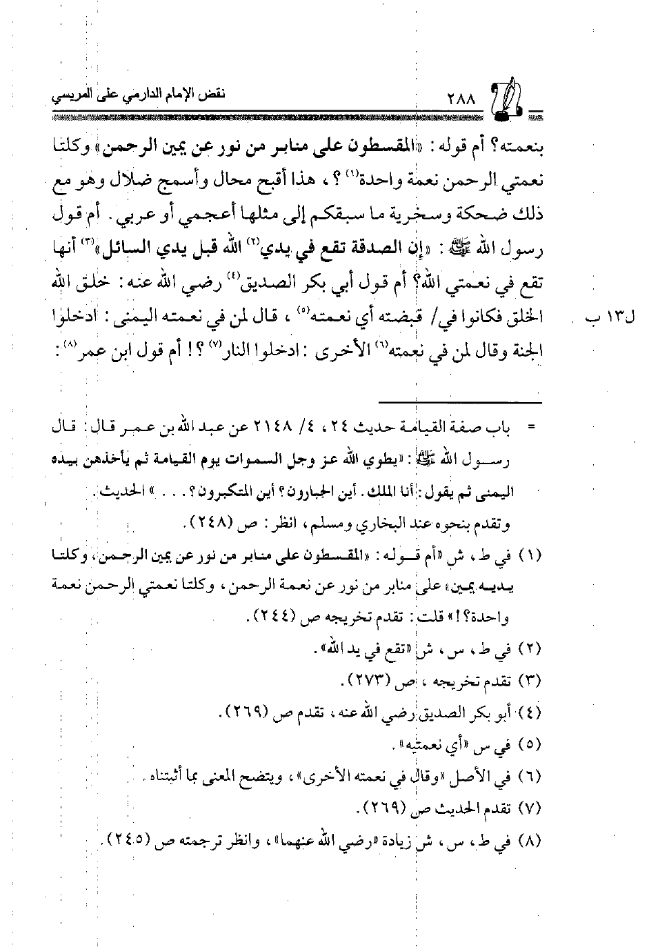 1 فِي ط، ش "أَمْ قَوْلُهُ: "الْمُقْسِطُونَ عَلَى مَنَابِرَ مِنْ نُورٍ عَنْ يَمِينِ الرَّحْمَنِ، وكلتا يَدَيْهِ يَمِين" عَلَى مَنَابِرَ مِنْ نُورٍ عَنْ نعْمَة الرَّحْمَنِ، وَكِلْتَا نِعْمَتَيِ الرَّحْمَنِ نِعْمَةٌ وَاحِدَة؟! قلت: تقدم تَخْرِيجه ص"244".