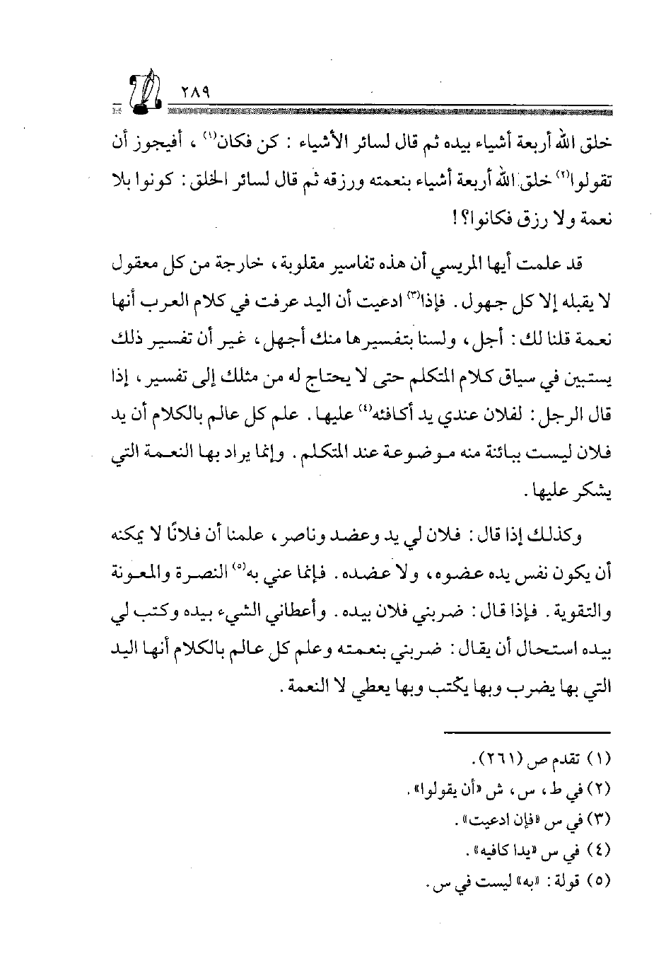 قَدْ عَلِمْتَ أَيُّهَا الْمَرِيسِيُّ أَنَّ هَذِهِ تَفَاسِيرُ مَقْلُوبَةٌ، خَارِجَةٌ مِنْ كل مَعْقُول لَا يقبله إِلَى كُلُّ جَهُولٍ، فَإِذَا3 ادَّعَيْتَ أَنَّ الْيَدَ عُرِفَتْ فِي كَلَامِ الْعَرَبِ أَنَّهَا نِعْمَةٌ قُلْنَا لَكَ: أَجَلْ، وَلَسْنَا بِتَفْسِيرِهَا مِنْكَ أَجْهَلَ غَيْرَ أَن تسفير ذَلِكَ يَسْتَبِينُ فِي سِيَاقِ كَلَامِ الْمُتَكَلِّمِ حَتَّى لَا يَحْتَاجَ لَهُ مِثْلِكَ إِلَى تَفْسِيرٍ، إِذَا قَالَ الرَّجُلُ: لِفُلَانٍ عِنْدِي يَدٌ أُكَافِئُهُ4 عَلَيْهَا، عَلِمَ كُلُّ عَالِمٍ بِالْكَلَامِ أَنَّ يَدَ فُلَانٍ لَيْسَتْ بِبَائِنَةٍ مِنْهُ مَوْضُوعَةً عِنْدَ الْمُتَكَلِّمِ، وَإِنَّمَا يُرَادُ بِهَا النِّعْمَةُ الَّتِي يُشْكَرُ عَلَيْهَا.
