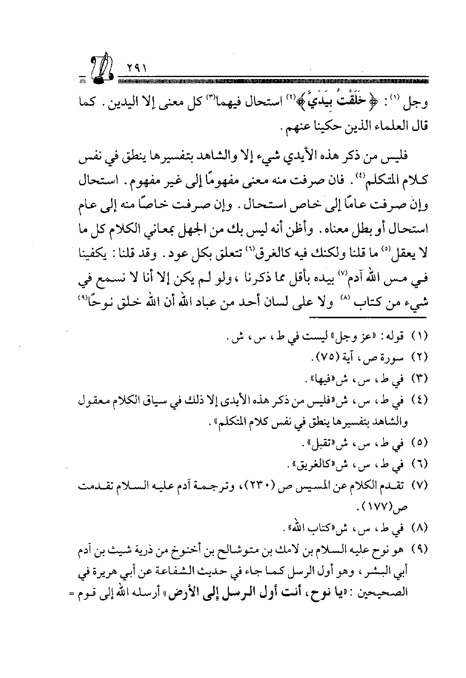 فَلَيْسَ مِنْ ذِكْرِ هَذِهِ الْأَيْدِي شَيْءٌ إِلَّا وَالشَّاهِدُ بِتَفْسِيرِهَا يَنْطِقُ فِي نَفْسِ كَلَامِ الْمُتَكَلِّمِ4 فَإِنْ صَرَفْتَ مِنْهُ مَعْنًى مَفْهُومًا إِلَى غَيْرِ مَفْهُومٍ، اسْتَحَالَ وَإِنْ صَرَفْتَ عَامًّا إِلَى خَاصٍّ اسْتَحَالَ، وَإِنْ صَرَفْتَ خَاصًّا مِنْهُ إِلَى عَامٍّ اسْتَحَالَ أَوْ بَطُلَ مَعْنَاهُ وَأَظُنُّ أَنَّهُ لَيْسَ بِكَ مِنَ الْجَهْلِ بِمَعَانِي الْكَلَامِ كُلُّ مَا لَا يُعْقَلُ5 مَا قُلْنَا وَلَكِنَّكَ فِيهِ كَالْغَرِقِ6 تَتَعَلَّقُ بِكُلِّ عُودٍ، وَقَدْ قُلْنَا: يَكْفِينَا فِي مَسِّ اللَّهِ آدَمَ7 بِيَدِهِ بِأَقَلَّ مِمَّا ذَكَرْنَا وَلَوْ لَمْ يَكُنْ إِلَّا أَنَّا لَا نَسْمَعُ فِي شَيْءٍ مِنْ كِتَابٍ8 وَلَا عَلَى لِسَانِ أَحَدٍ مِنْ عِبَادِ اللَّهِ أَن الله خلق نوحًا9