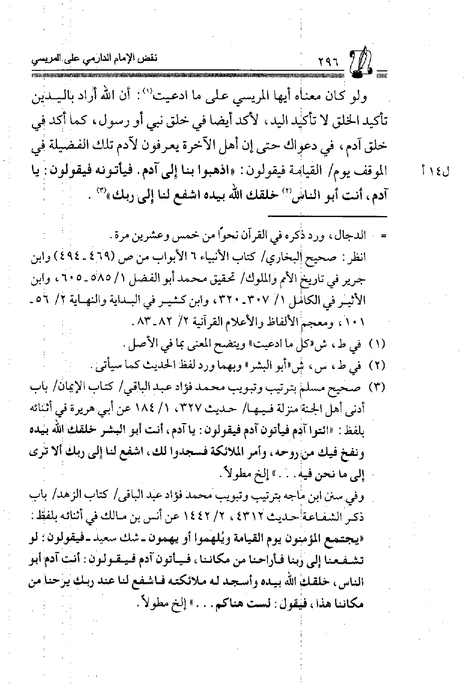 وَلَوْ كَانَ مَعْنَاهُ أَيُّهَا الْمَرِيسِيُّ عَلَى مَا ادَّعَيْتَ1: أَنَّ اللَّهَ أَرَادَ بِالْيَدَيْنِ تَأْكِيدَ الْخَلْقِ لَا تَأْكِيدَ الْيَدِ، لَأَكَّدَ أَيْضًا فِي خَلْقِ نَبِيٍّ أَوْ رَسُولٍ، كَمَا أَكَّدَ فِي خَلْقِ آدَمَ فِي دَعْوَاكَ حَتَّى إِنَّ أَهْلَ الْآخِرَةِ يَعْرِفُونَ لِآدَمَ تِلْكَ الْفَضِيلَةَ فِي الْمَوْقِفِ يَوْمَ/ الْقِيَامَةِ فَيَقُولُونَ: "اذْهَبُوا بِنَا إِلَى آدَمَ، فَيَأْتُونَهُ فَيَقُولُونَ: يَا آدَمُ أَنْتَ أَبُو النَّاسِ 2 خَلَقَكَ اللَّهُ بِيَدِهِ اشْفَعْ لَنَا إِلَيّ رَبك" 3.