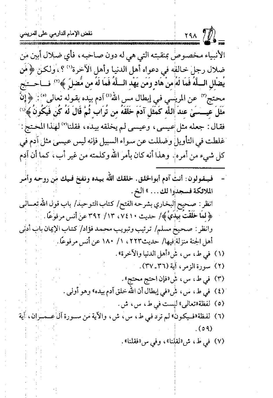 الْأَنْبِيَاءِ مَخْصُوصٌ بِمَنْقَبَتِهِ الَّتِي هِيَ لَهُ دُونَ صَاحِبِهِ، فَأَيُّ ضَلَالٍ أَبْيَنُ مِنْ ضَلَالِ رَجُلٍ خَالَفَهُ فِي دَعْوَاهُ أَهْلُ الدُّنْيَا وَأَهْلُ الْآخِرَةِ1؟، وَلَكِنْ {وَمَنْ يُضْلِلِ اللَّهُ فَمَا لَهُ مِنْ هَادٍ، وَمَنْ يَهْدِ اللَّهُ فَمَا لَهُ مِنْ مُضِلٍّ} 2 فَاحْتَجَّ مُحْتَجٌّ3 عَنِ الْمَرِيسِيِّ فِي ابطاب مَسِّ اللَّهِ4 آدَمَ بِيَدِهِ بِقَوْلِهِ تَعَالَى5 {إِنَّ مَثَلَ عِيسَى عِنْدَ اللَّهِ كَمَثَلِ آدَمَ خَلَقَهُ مِنْ تُرَابٍ ثُمَّ قَالَ لَهُ كُنْ فَيَكُونُ} 6 فَقَالَ: جَعَلَهُ مِثْلَ عِيسَى، وَعِيسَى لَمْ يَخْلُقْهُ بِيَدِهِ، فَقُلْنَا7 لِهَذَا الْمُحْتَجِّ غَلِطْتَ فِي التَّأْوِيلِ وَضَلَلْتَ عَنْ سَوَاءِ السَّبِيلِ فَإِنَّهُ لَيْسَ عِيسَى مِثْلَ آدَمَ فِي كُلِّ شَيْءٍ مِنْ أَمْرِهِ وَهَذَا أَنَّهُ كَانَ بِأَمْرِ اللَّهِ وَكَلِمَتِهِ مِنْ غَيْرِ أَبٍ، كَمَا أَنَّ آدَمَ