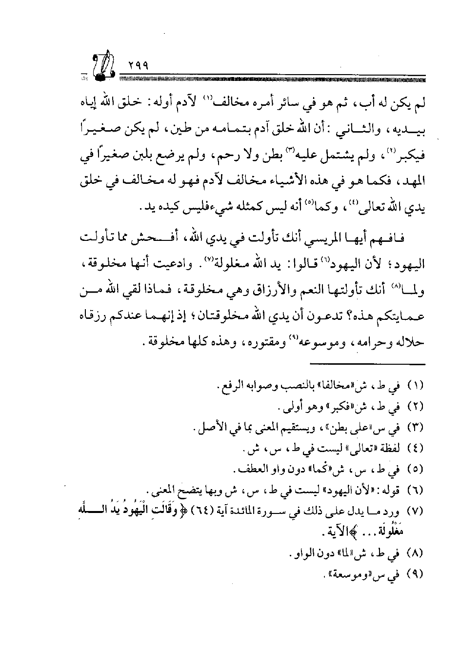 فَافْهَمْ أَيُّهَا الْمَرِيسِيُّ أَنَّكَ تَأَوَّلْتَ فِي يَدَيِ اللَّهِ، أَفْحَشَ مِمَّا تَأَوَّلَتِ الْيَهُودُ؛ لِأَنَّ الْيَهُودَ6 قَالُوا: يَدُ اللَّهِ مَغْلُولَةٌ7 وَادَّعَيْتَ أَنَّهَا مَخْلُوقَةٌ وَلَمَّا 8 أَنَّكَ تَأَوَّلْتَهَا النِّعَمَ وَالْأَرْزَاقَ وَهِيَ مَخْلُوقَةٌ، فَمَاذَا لَقِيَ اللَّهُ مِنْ عَمَايَتِكُمْ هَذِهِ؟ تَدَّعُونَ أَنَّ يَدَيِ الله مخلوقتان، إِنَّهُمَا عِنْدَكُمْ رِزْقَاهُ حَلَالُهُ وَحَرَامُهُ، وَمَوْسُوعُهُ9 وَمَقْتُورُهُ، وَهَذِهِ كُلُّهَا مَخْلُوقَةٌ.
