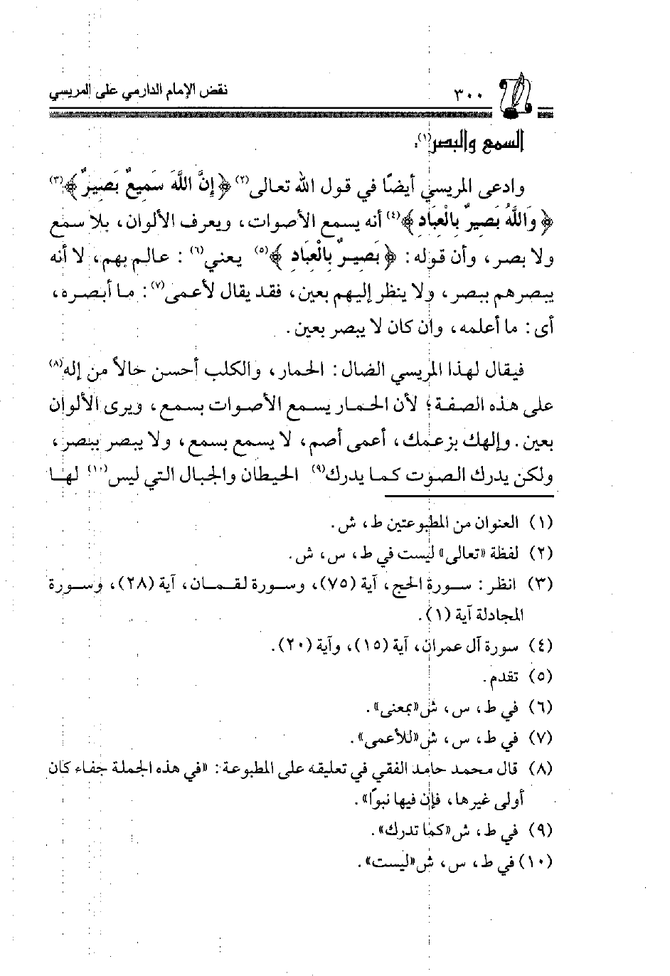وَادَّعَى الْمَرِيسِيُّ أَيْضًا فِي قَوْلِ اللَّهِ تَعَالَى2 {إِنَّ اللَّهَ سَمِيعٌ بَصِيرٌ} 3 {وَاللَّهُ بَصِيرٌ بِالْعِبَادِ} 4 أَنَّهُ يَسْمَعُ الْأَصْوَاتَ، وَيَعْرِفُ الْأَلْوَانَ، بِلَا سَمْعٍ وَلَا بَصَرٍ، وَأَنَّ قَوْله {بَصِيرٌ بِالْعِبَادِ} 5 يَعْنِي6: عَالِمٌ بِهِمْ، لَا أَنَّهُ يُبْصِرُهُمْ بِبَصَرٍ، وَلَا يَنْظُرُ إِلَيْهِمْ بِعَيْنٍ، فَقَدْ يُقَالُ لِأَعْمَى7: مَا أَبْصَرَهُ أَيْ: مَا أَعْلَمَهُ، وَإِنْ كَانَ لَا يُبْصِرُ بِعَيْنٍ.