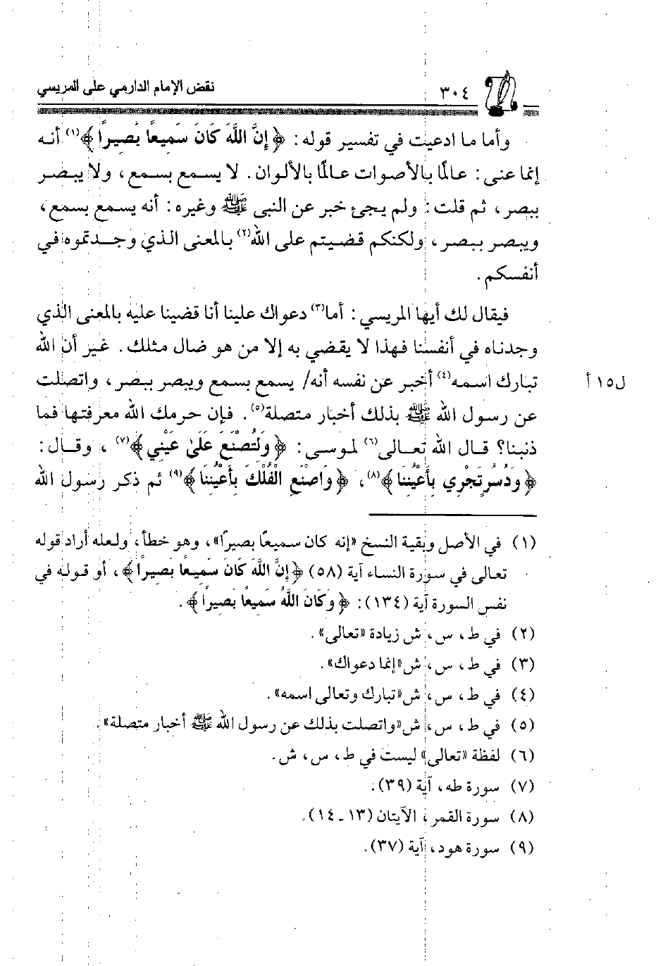 فَيُقَالُ لَكَ أَيُّهَا الْمَرِيسِيُّ: أَمَّا3 دَعْوَاكَ عَلَيْنَا أَنَّا قَضَيْنَا عَلَيْهِ بِالْمَعْنَى الَّذِي وَجَدْنَاهُ فِي أَنْفُسِنَا فَهَذَا لَا يَقْضِي بِهِ إِلَّا مَنْ هُوَ ضال مصلك. غَيْرَ أَنَّ اللَّهَ تَبَارَكَ اسْمُهُ4 أَخْبَرَ عَنْ نَفْسِهِ أَنَّهُ، يَسْمَعُ بِسَمْعٍ وَيُبْصِرُ بِبَصَرٍ، وَاتَّصَلَتْ عَنْ رَسُولِ اللَّهِ صَلَّى اللَّهُ عَلَيْهِ وَسَلَّمَ بِذَلِكَ أَخْبَارٌ مُتَّصِلَةٌ5 فَإِنْ حَرَمَكَ اللَّهَ مَعْرِفَتَهَا فَمَا ذَنْبُنَا؟ قَالَ اللَّهُ تَعَالَى6 لِمُوسَى {وَلِتُصْنَعَ عَلَى عَيْنِي} 7، وَقَالَ: {وَدُسُرٍ، تَجْرِي بِأَعْيُنِنَا} 8 {واصْنَعِ الْفُلْكَ بِأَعْيُنِنَا} 9 ثمَّ ذكر رَسُول الله