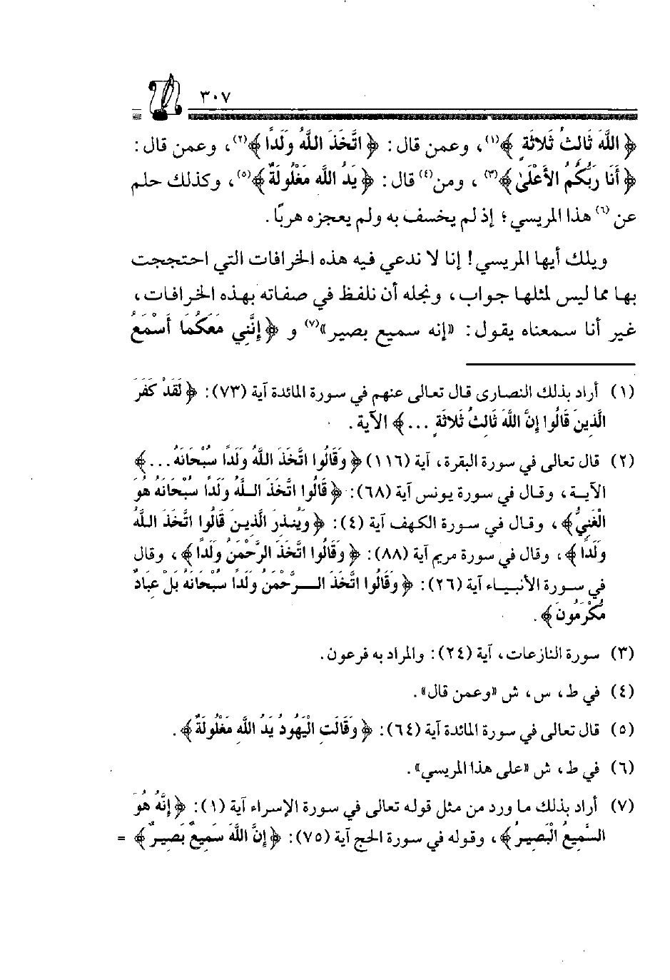 {اللَّهَ ثَالِثُ ثَلاثَةٍ} 1، وَعَمَّنْ قَالَ: {اتَّخَذَ اللَّهُ وَلَداً} 2، وَعَمَّنْ قَالَ: {أَنَا رَبُّكُمُ الْأَعْلَى} 3 وَمَنْ4 قَالَ: {يَدُ اللَّهِ مَغْلُولَةٌ} 5 وَكَذِلَكَ حَلِمَ عَنْ6 هَذَا الْمَرِيسِيِّ، إِذْ لَمْ يَخْسِفْ بِهِ وَلَمْ يُعْجِزْهُ هَرَبًا.