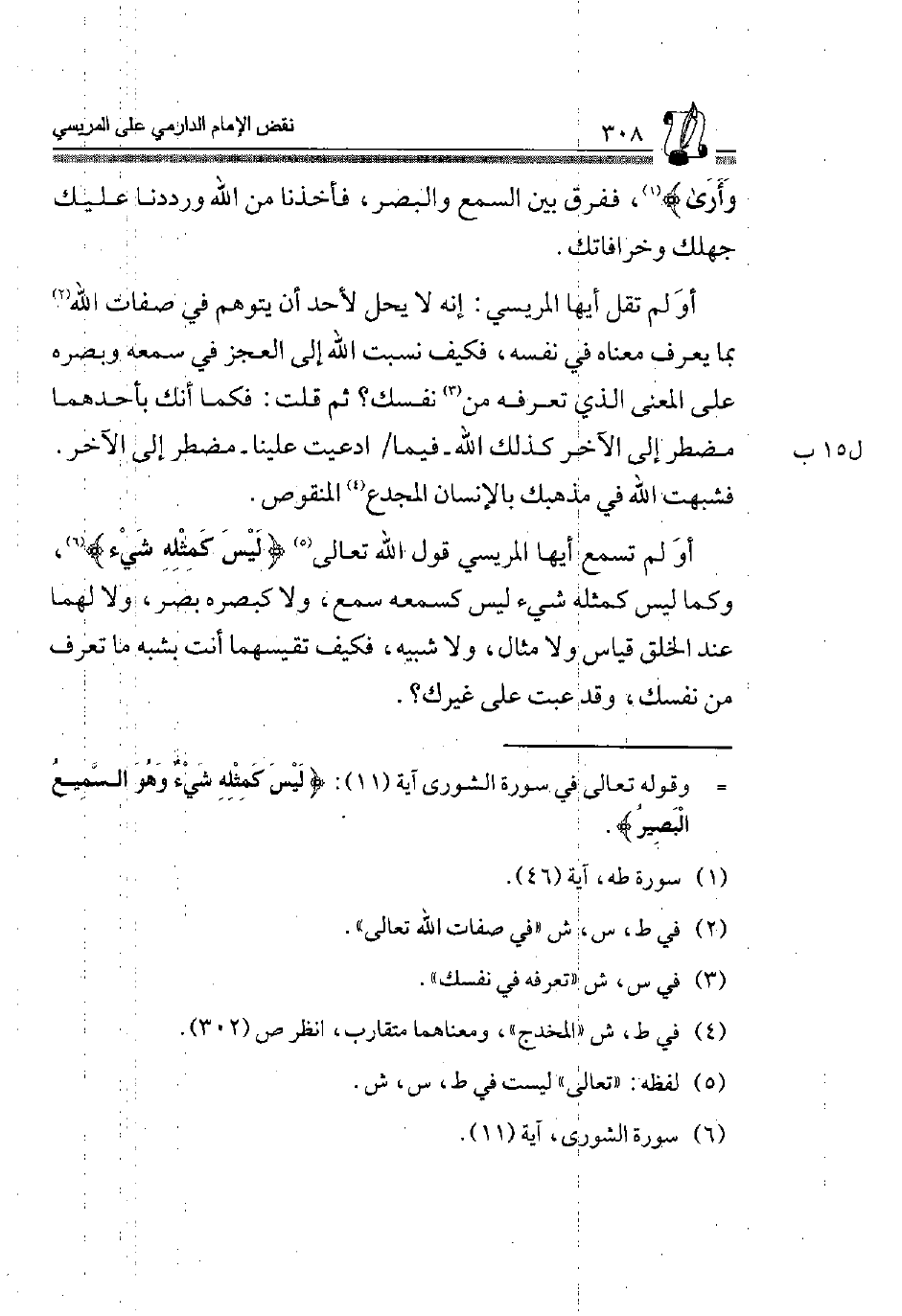 أَو لم تَسْمَعْ أَيُّهَا الْمَرِيسِيُّ قَوْلَ اللَّهِ تَعَالَى5 {لَيْسَ كَمِثْلِهِ شَيْءٌ} 6 وَكَمَا لَيْسَ كَمِثْلِهِ شَيْءٌ لَيْسَ كَسَمْعِهِ سَمْعٌ، وَلَا كَبَصَرِهِ بَصَرٌ وَلَا لَهُمَا عِنْدَ الْخَلْقِ قِيَاسٌ وَلَا مِثَالٌ، وَلَا شَبِيهٌ، فَكَيْفَ تَقِيسُهُمَا أَنْتَ بِشَبَهِ مَا تَعْرِفُ مِنْ نَفْسِكَ، وَقَدْ عِبْتَ عَلَى غَيْرك؟.