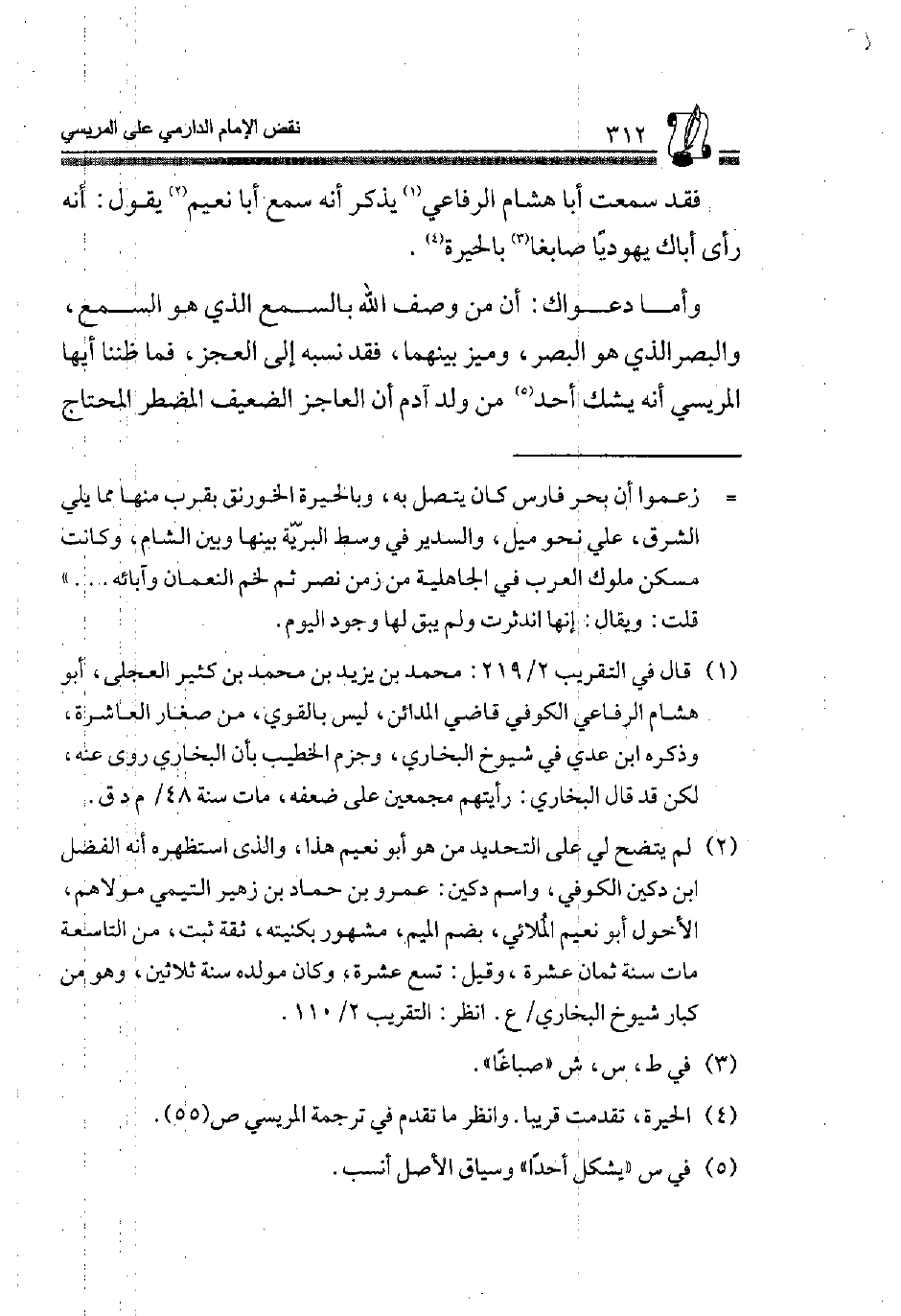 وَأَمَّا دَعْوَاكَ: أَنَّ مَنْ وَصَفَ اللَّهَ بِالسَّمْعِ الَّذِي هُوَ السَّمْعُ وَالْبَصَرُ الَّذِي هُوَ الْبَصَر، ومير بَيْنَهُمَا، فَقَدْ نَسَبَهُ إِلَى الْعَجْزِ، فَمَا ظَنَنَّا أَيُّهَا الْمَرِيسِيُّ أَنَّهُ بشك أَحَدٌ5 مِنْ وَلَدِ آدَمَ أَنَّ الْعَاجِز الضَّعِيف الْمُضْطَر الْمُحْتَاج