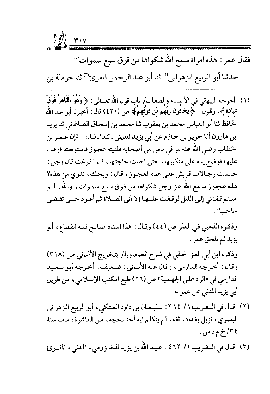 1 أخرجه الْبَيْهَقِيّ فِي الْأَسْمَاء وَالصِّفَات، بَاب قَول اللَّهُ تَعَالَى {وَهُوَ الْقَاهِرُ فَوْقَ عِبَادِهِ} وَقَول: {يَخَافُونَ رَبَّهُمْ مِنْ فَوْقِهِمْ} ص"420" قَالَ: أخبرنَا أَبُو عبد الله الْحَافِظ، ثَنَا أَبُو الْعَبَّاس مُحَمَّد بن يَعْقُوب، ثَنَا مُحَمَّد بن إِسْحَاق الصَّاغَانِي، ثَنَا يزِيد بن هَارُون، أَنا جرير بن حَازِم، عَن أبي يزِيد الْمَدِينِيّ -كَذَا- قَالَ: "إِن عُمَرَ بْنِ الْخَطَّابِ رَضِيَ اللَّهُ عَنهُ مر فِي نَاس من أَصْحَابه فَلَقِيته عَجُوز فاستوقفته فَوقف عَلَيْهَا فَوضع يَده على منكبيها، حَتَّى قَضَت حَاجَتهَا، فَلَمَّا فرغت قَالَ رجل: حبست رجالات قُرَيْش على هَذِه الْعَجُوز، قَالَ: وَيحك، تَدْرِي من هَذِه؟ هَذِه عَجُوز سمع الله عز وَجل شكواها من فَوق سبعه سموات، وَالله، لَو استوقفتني إِلَى اللَّيْل لوقفت عَلَيْهَا إِلَّا آتِي الصَّلَاة، ثمَّ أَعُود حَتَّى تقضي حَاجَتهَا".