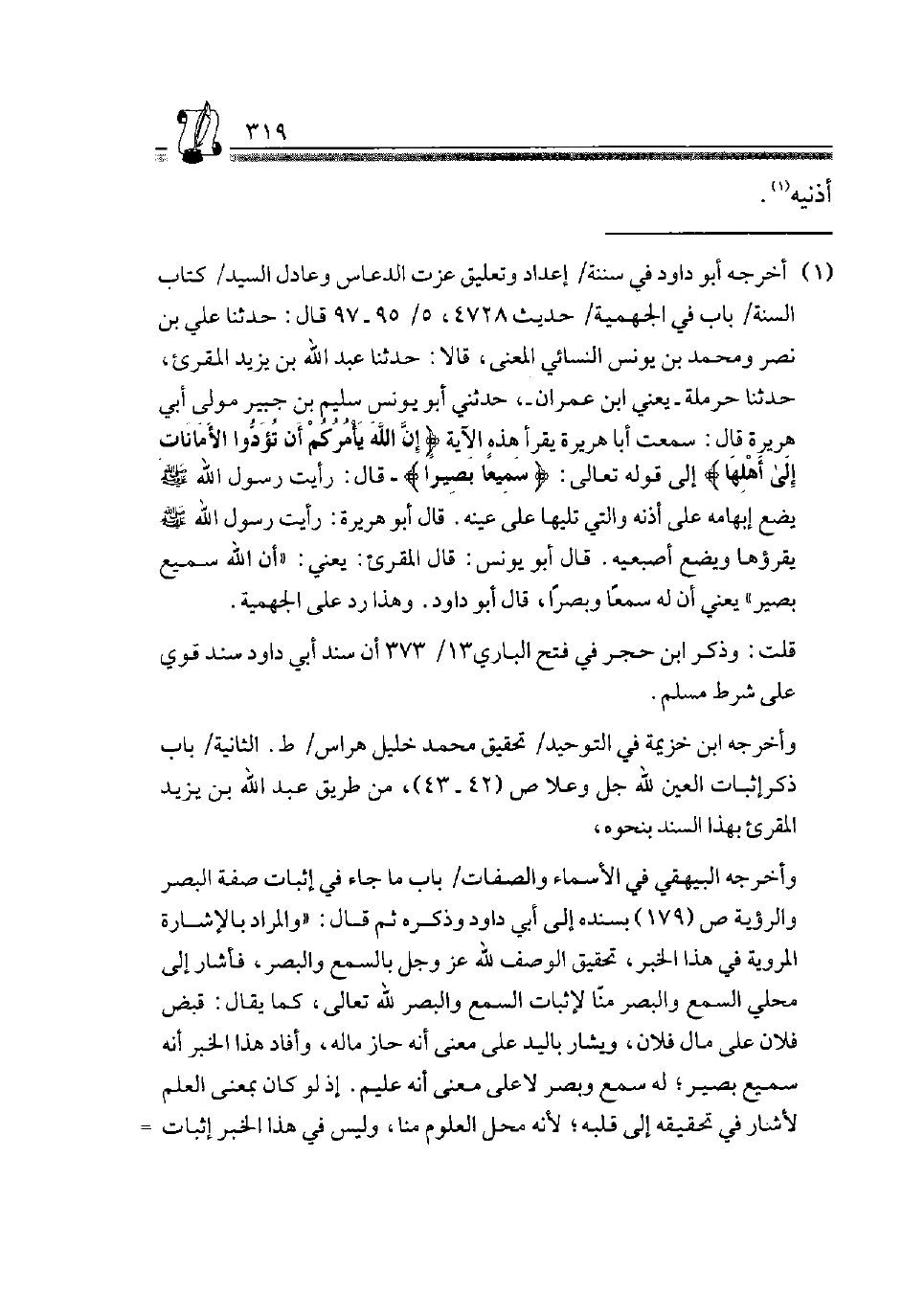 1 أخرجه أَبُو دَاوُد فِي سنَنه، إعداد وَتَعْلِيق عزت الدعاس وعادل السَّيِّد، كتاب السّنة، بَاب فِي الْجَهْمِية، حَدِيث 4728، 5/ 95-97 قَالَ: حَدثنَا عَليّ بن نصر، وَمُحَمّد بن يُونُس النَّسَائِيّ الْمَعْنى، قَالَا: حَدثنَا عبد الله بن يزِيد الْمُقْرِئ، حَدثنَا حَرْمَلَة -يَعْنِي ابْن عمرَان-، حَدَّثَنِي أَبُو يُونُسَ سُلَيْمُ بْنُ جُبَير مولى أبي هُرَيْرَة وَقَالَ: سَمِعت أَبَا هُرَيْرَة يقْرَأ هَذِه الْآيَة {إِنَّ اللَّهَ يَأْمُرُكُمْ أَنْ تُؤَدُّوا الْأَمَانَاتِ إِلَى أَهْلِهَا} إِلَى قَول: {سَمِيعاً بَصِيراً} - قَالَ: رَأَيْت رَسُولِ اللَّهِ صَلَّى اللَّهُ عَلَيْهِ وَسلم يضع إِبْهَامَهُ عَلَى أُذُنِهِ وَالَّتِي تَلِيهَا على عينه، قَالَ أَبُو هُرَيْرَة رَأَيْت رَسُولِ اللَّهِ صَلَّى اللَّهُ عَلَيْهِ وَسلم يقْرؤهَا وَيَضَع أصبعيه. قَالَ أَبُو يُونُس: قَالَ الْمُقْرِئ: يَعْنِي "أَن الله سميع بَصِير" يَعْنِي أَن لَهُ سمعا وبصرًا قَالَ أَبُو دَاوُد وَهَذَا رد على الْجَهْمِية.