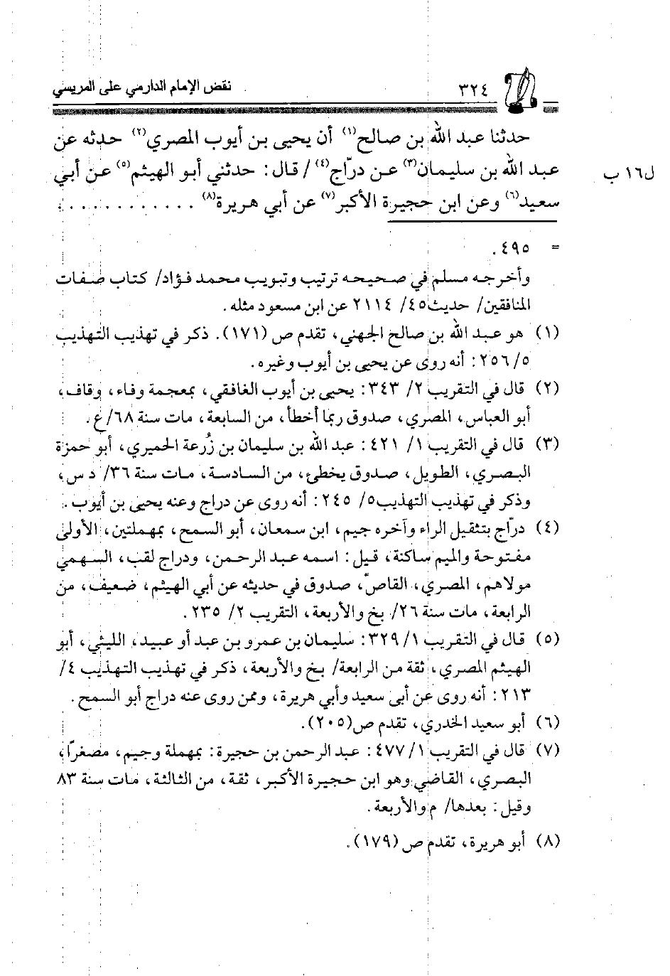 5 قَالَ فِي التَّقْرِيب 1/ 329: سُلَيْمَان بن عَمْرو بن عبد أَو عبيد، اللَّيْثِيّ، أَبُو الْهَيْثَم الْمصْرِيّ ثِقَة من الرَّابِعَة، بخ وَالْأَرْبَعَة، ذكر فِي تَهْذِيب التَّهْذِيب 4/ 213: أَنه روى عَن أبي سعيد وَأبي هُرَيْرَة، وَمِمَّنْ روى عَنهُ دراج أَبُو السَّمْح.