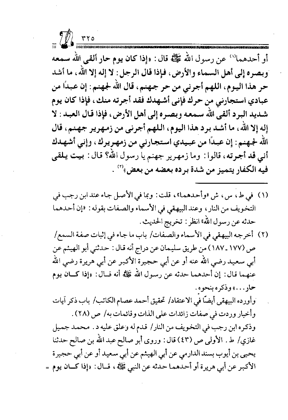 2 أخرجه الْبَيْهَقِيّ فِي الْأَسْمَاء وَالصِّفَات، بَاب مَا جَاءَ فِي إِثْبَات صفة السّمع، ص"177-187" من طَرِيق سُلَيْمَان عَن دراج أَنه قَالَ: حَدَّثَنِي أَبُو الْهَيْثَمِ، عَنْ أبي سعيد رَضِي الله عَنهُ أَو عَن أبي حُجَيْرَةَ الْأَكْبَر، عَنْ أَبِي هُرَيْرَةَ رَضِيَ اللَّهُ عَنْهُمَا قَالَ: إِنَّ أَحدهمَا حَدثهُ عَنْ رَسُولِ اللَّهِ صَلَّى اللَّهُ عَلَيْهِ وَسلم أَنه قَالَ: "إِذَا كَانَ يَوْمٌ حَارٌّ ... " وَذكره بِنَحْوِهِ.