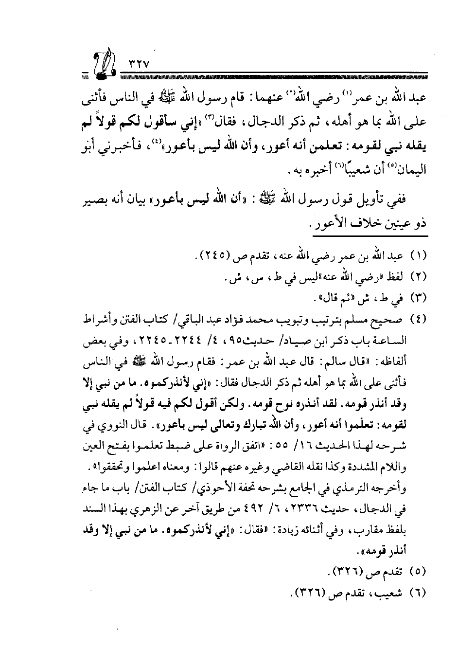 4 صَحِيح مُسلم بترتيب وتبويب مُحَمَّد فؤاد عبد الْبَاقِي، كتاب الْفِتَن وأشراط الشاعة بَاب ذكر ابْن صياد، حَدِيث 95، 4/ 2244-2245، وَفِي بعض أَلْفَاظه: "قَالَ سَالِمٌ: قَال عَبْدُ اللَّهِ بن عمر: فَقَامَ رَسُولِ اللَّهِ صَلَّى اللَّهُ عَلَيْهِ وَسَلَّمَ فِي النَّاسِ فَأَثْنَى عَلَى اللَّهِ بِمَا هُوَ أَهْلُهُ، ثُمَّ ذكر الدَّجَّال فَقَالَ: "إِنِّي لأنذركموه. مَا مِنْ نَبِيٍّ إِلَّا وَقَدْ أنذر قومه. لقد أنذره نوح قومه. وَلَكِن أَقُول لكم فِيهِ قَوْلًا لَمْ يَقُلْهُ نَبِيٌّ لِقَوْمِهِ: تعلمُوا أَنه أَعور، وَأَن الله تبَارك وَتَعَالَى لَيْسَ بأعور" قَالَ النَّوَوِيّ فِي شَرحه لهَذَا الحَدِيث 16/ 55: "اتّفق الروَاة على ضبط تعملوا بِفَتْح الْعين وَاللَّام الْمُشَدّدَة وَكَذَا نَقله القَاضِي وَغَيره عَنْهُم قَالُوا: وَمَعْنَاهُ اعلموا وتحققوا".