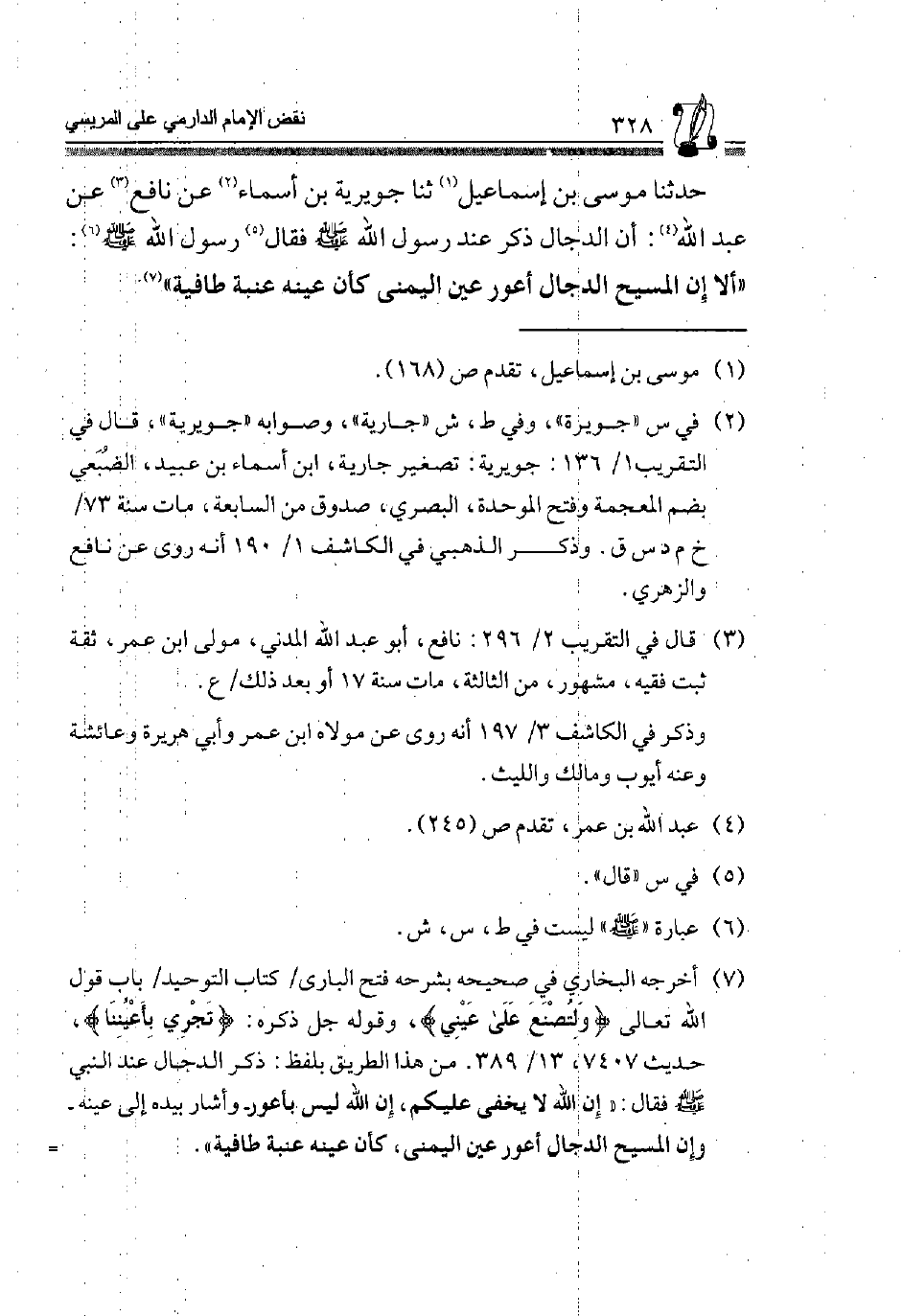 حَدَّثَنَا مُوسَى بْنُ إِسْمَاعِيلَ1، ثَنَا جُوَيْرِيَةُ بْنُ أَسْمَاءَ2، عَنْ نَافِعٍ3، عَنْ عَبْدِ اللَّهِ4 أَنَّ الدَّجَّالَ ذُكِرَ عِنْدَ رَسُولِ اللَّهِ صَلَّى الله عَلَيْهِ وَسلم فَقَالَ5 رَسُولُ اللَّهِ صَلَّى اللَّهُ عَلَيْهِ وَسَلَّمَ6: "أَلَا إِنَّ الْمَسِيحَ الدَّجَّالَ أَعْوَرُ عَيْنِ الْيُمْنَى كَأَنَّ عينه عنبة طافية" 7.