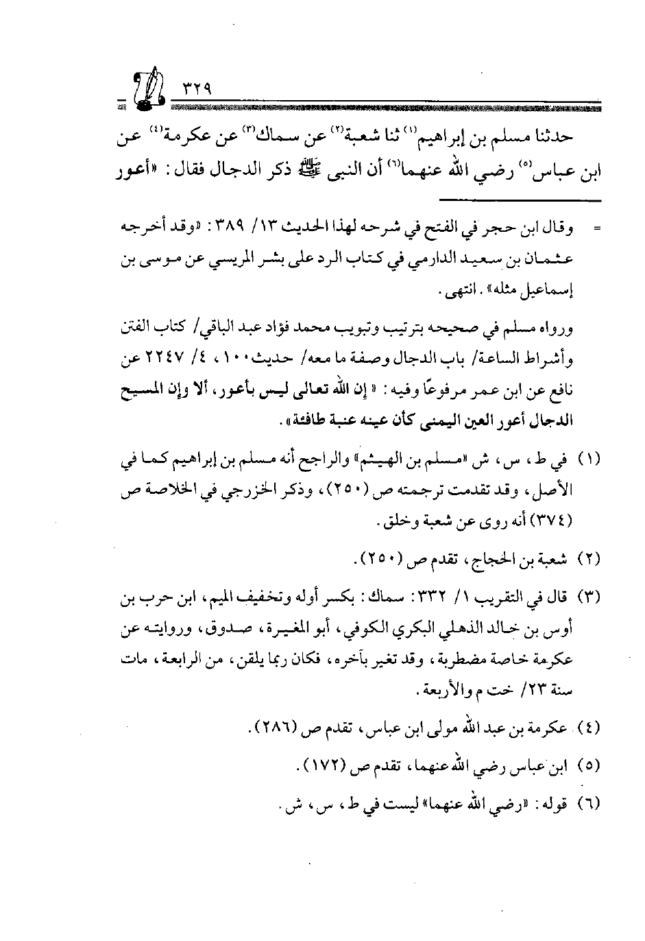 حَدَّثَنَا مُسْلِمُ بْنُ إِبْرَاهِيمَ1، ثَنَا شُعْبَةُ2، عَنْ سِمَاكٍ3، عَنْ عِكْرِمَةَ4، عَنِ ابْنِ عَبَّاسٍ5 رَضِيَ اللَّهُ عَنْهُمَا6 أَنَّ النَّبِيَّ صَلَّى اللَّهُ عَلَيْهِ وَسَلَّمَ ذَكَرَ الدَّجَّالَ فَقَالَ: "أَعور