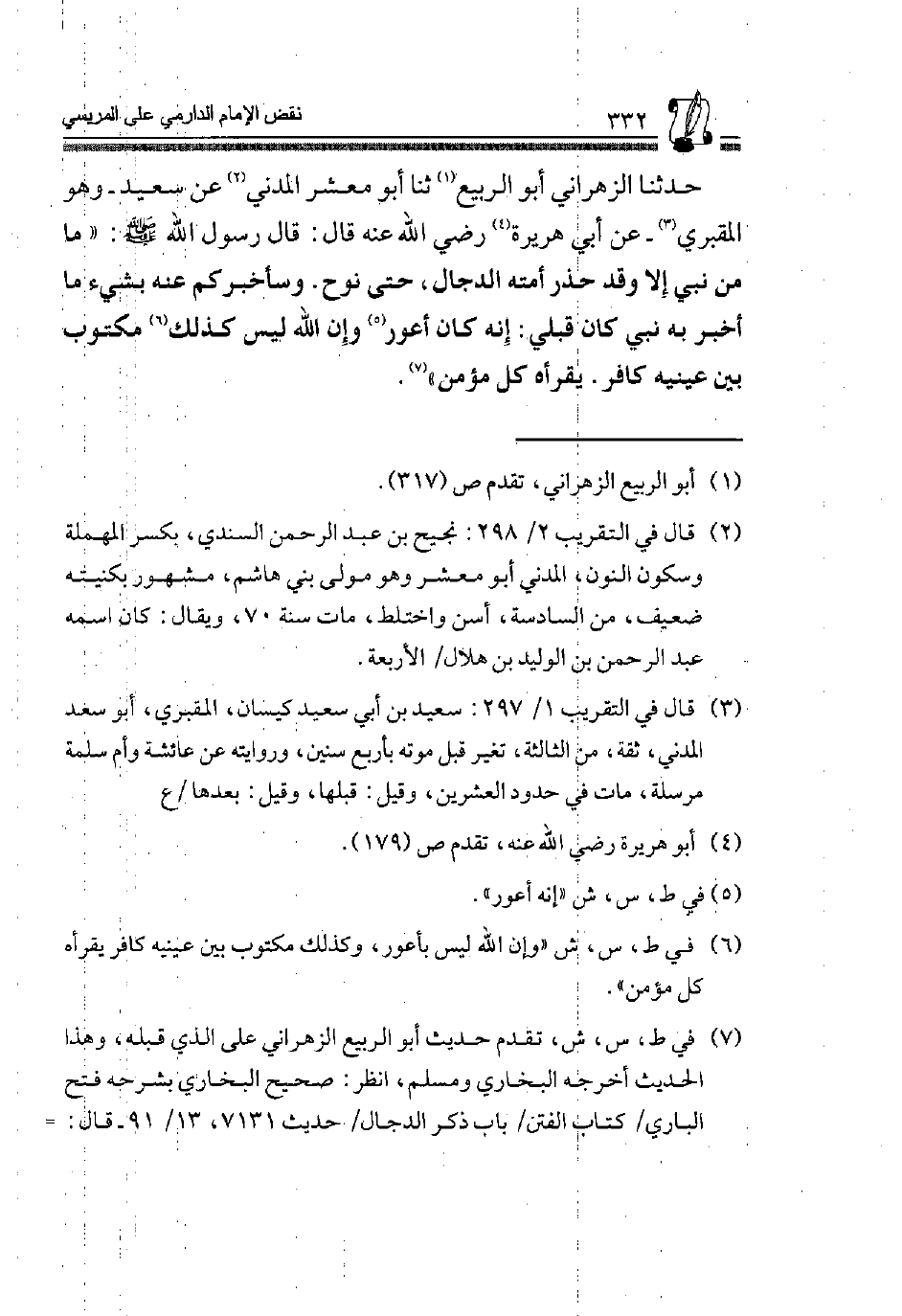 حَدَّثَنَا الزَّهْرَانِيُّ أَبُو الرَّبِيعِ1، ثَنَا أَبُو مَعْشَرٍ الْمَدَنِيُّ2، عَنْ سَعِيدٍ -وَهُوَ الْمَقْبُرِيُّ3- عَنْ أَبِي هُرَيْرَةَ4 رَضِيَ اللَّهُ عَنْهُ قَالَ: قَالَ: رَسُولِ اللَّهِ صَلَّى اللَّهُ عَلَيْهِ وَسَلَّمَ: "مَا مِنْ نَبِيٍّ إِلَّا وَقَدْ حَذَّرَ أُمَّتَهُ الدَّجَّالَ، حَتَّى نُوحٍ. وَسَأُخْبِرُكُمْ عَنْهُ بِشَيْءٍ مَا أَخْبَرَ بِهِ نَبِيٌّ كَانَ قَبْلِي: إِنَّه كَانَ أَعور 5 وَإِن اللَّهَ لَيْسَ كَذَلِكَ 6 مَكْتُوبٌ بَيْنَ عَيْنَيْهِ كَافِرٌ. يَقْرَأُهُ كُلُّ مُؤْمِنٍ" 7.