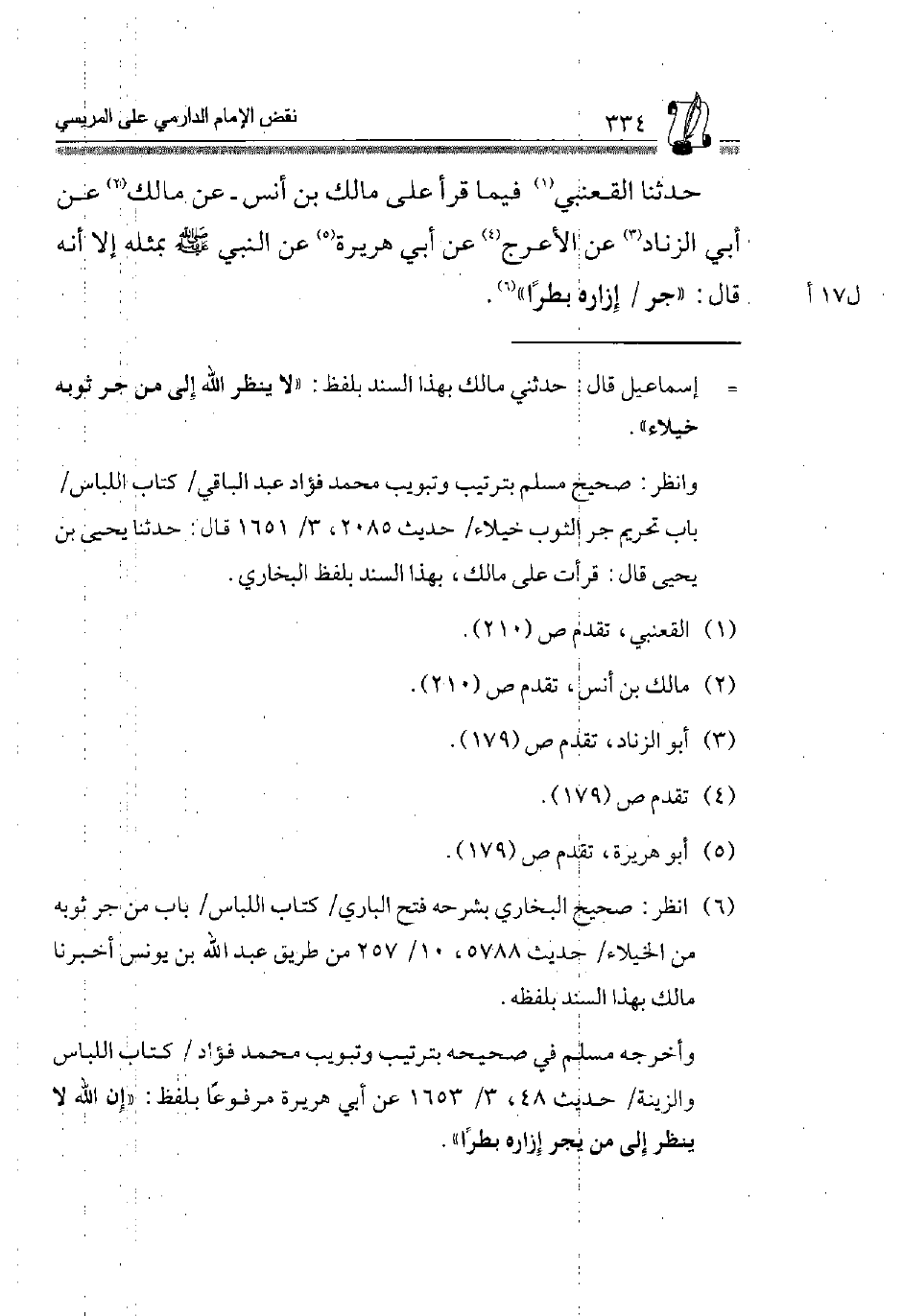 6 انْظُر: صَحِيح البُخَارِيّ بشرحه فتح الْبَارِي، كتاب اللبَاس، بَاب من جر ثَوْبه من الْخُيَلَاء، حَدِيث 5788، 10/ 257 من طَرِيق عبد الله بن يُونُس أخبرنَا مَالك بِهَذَا السَّنَد بِلَفْظِهِ.