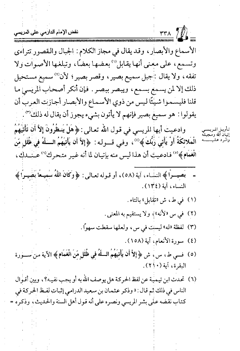 وَادَّعَيْتَ أَيُّهَا الْمَرِيسِيُّ فِي قَوْلِ اللَّهِ تَعَالَى {هَلْ يَنْظُرُونَ إِلَّا أَنْ تَأْتِيَهُمُ الْمَلائِكَةُ أَوْ يَأْتِيَ رَبُّك} 1، وَفِي قَوْلِهِ: {إِلَّا أَنْ يَأْتِيَهُمُ اللَّهُ فِي ظُلَلٍ مِنَ الْغَمَامِ} 2 فَادَّعَيْتَ أَنَّ هَذَا لَيْسَ مِنْهُ بِإِتْيَانٍ لَمَّا أَنَّهُ غَيْرُ مُتَحَرِكٍّ3 عنْدك،