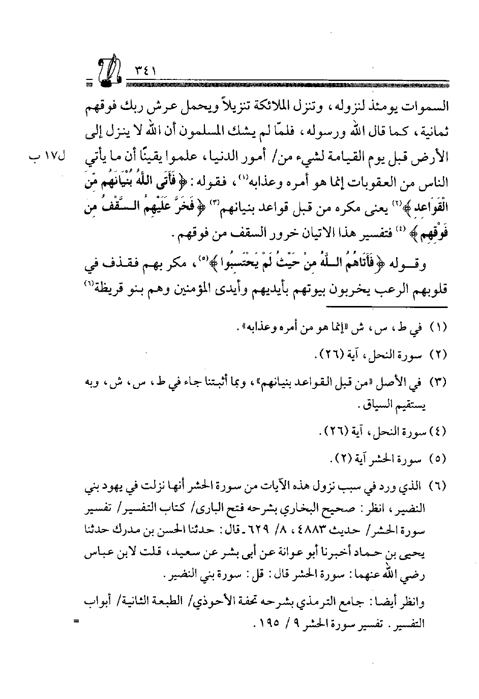 6 الَّذِي ورد فِي سَبَب نزُول هَذِه الْآيَات من سُورَة الْحَشْر أَنَّهَا نزلت فِي يهود بني النَّضِير، انْظُر: صَحِيح البُخَارِيّ بشرحه فتح الْبَارِي، كتاب التَّفْسِير، تَفْسِير سُورَة الْحَشْر، حَدِيث 488-، 8/ 629- قَالَ: حَدثنَا الْحسن بن مدرك حَدثنَا يحيى بن حَمَّاد أخبرنَا أَبُو عَوَانَةَ عَنْ أَبِي بِشْرٍ عَن سعيد، قلت لِابْنِ عَبَّاس رَضِي الله عَنْهُمَا: سُورَة الْحَشْر قَالَ: قل: سُورَة بني النَّضِير.