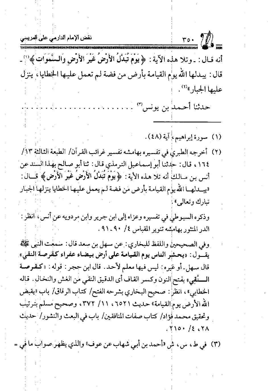 2 أخرجه الطَّبَرِيّ فِي تَفْسِيره بهامشه تَفْسِير غرائب الْقُرْآن، الطبعة الثَّالِثَة 13/ 164، قَالَ: حَدثنَا أَبُو إِسْمَاعِيل التِّرْمِذِيّ قَالَ: ثَنَا أَبُو صَالح بِهَذَا السَّنَد، عَن أنس بن مَالك أَنه تَلا هَذِهِ الْآيَةَ {يَوْمَ تُبَدَّلُ الأَرْضُ غَيْرَ الأَرْضِ} قَالَ: "يُبَدِّلُهَا اللَّهُ يَوْمَ الْقِيَامَةِ بِأَرْض من فضَّة لم يعْمل عَلَيْهَا الْخَطَايَا يتزلها الْجَبَّار تبَارك وَتَعَالَى".