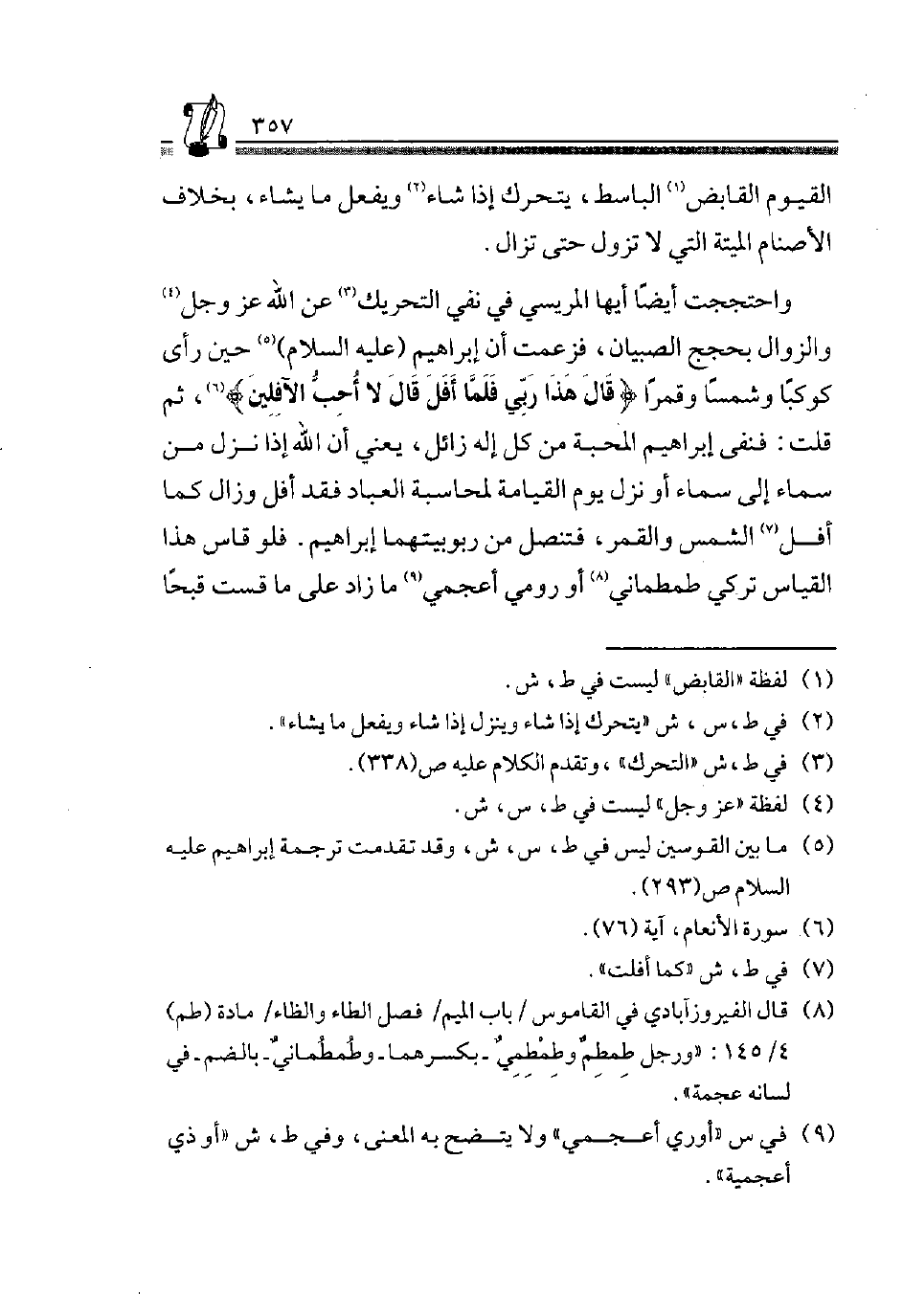 وَاحْتَجَجْتَ أَيْضًا أَيُّهَا المريسي فِي نفي التحريك3، عَنِ اللَّهِ عَزَّ وَجَلَّ4 وَالزَّوَالِ بِحُجَجِ الصِّبْيَانِ، فَزَعَمْتَ أَنَّ إِبْرَاهِيمَ "عَلَيْهِ السَّلَامُ"5 حِينَ رَأَى كَوْكَبًا وَشَمْسًا وَقَمَرًا {قَالَ هَذَا رَبِّي فَلَمَّا أَفَلَ قَالَ لَا أُحِبُّ الآفِلِينَ} 6 ثُمَّ قُلْتَ: فَنَفَى إِبْرَاهِيمُ الْمَحَبَّةَ من كل إِلَه زائل، يَعْنِي أَنَّ اللَّهَ إِذَا نَزَلَ مِنْ سَمَاءٍ إِلَى سَمَاءٍ أَوْ نَزَلَ يَوْمَ الْقِيَامَةِ لِمُحَاسَبَةِ الْعِبَادِ فَقَدْ أفل زَوَال كَمَا أَفَلَ7 الشَّمْسُ وَالْقَمَرُ، فَتَنَصَّلَ مِنْ رُبُوبِيَّتِهِمَا إِبْرَاهِيمُ، فَلَوْ قَاسَ هَذِا الْقِيَاسَ تُرْكِيٌّ طُمْطُمَانِيٌّ8 أَوْ رُومِيٌّ أَعْجَمِيٌّ9 مَا زَادَ عَلَى مَا قست قبحًا