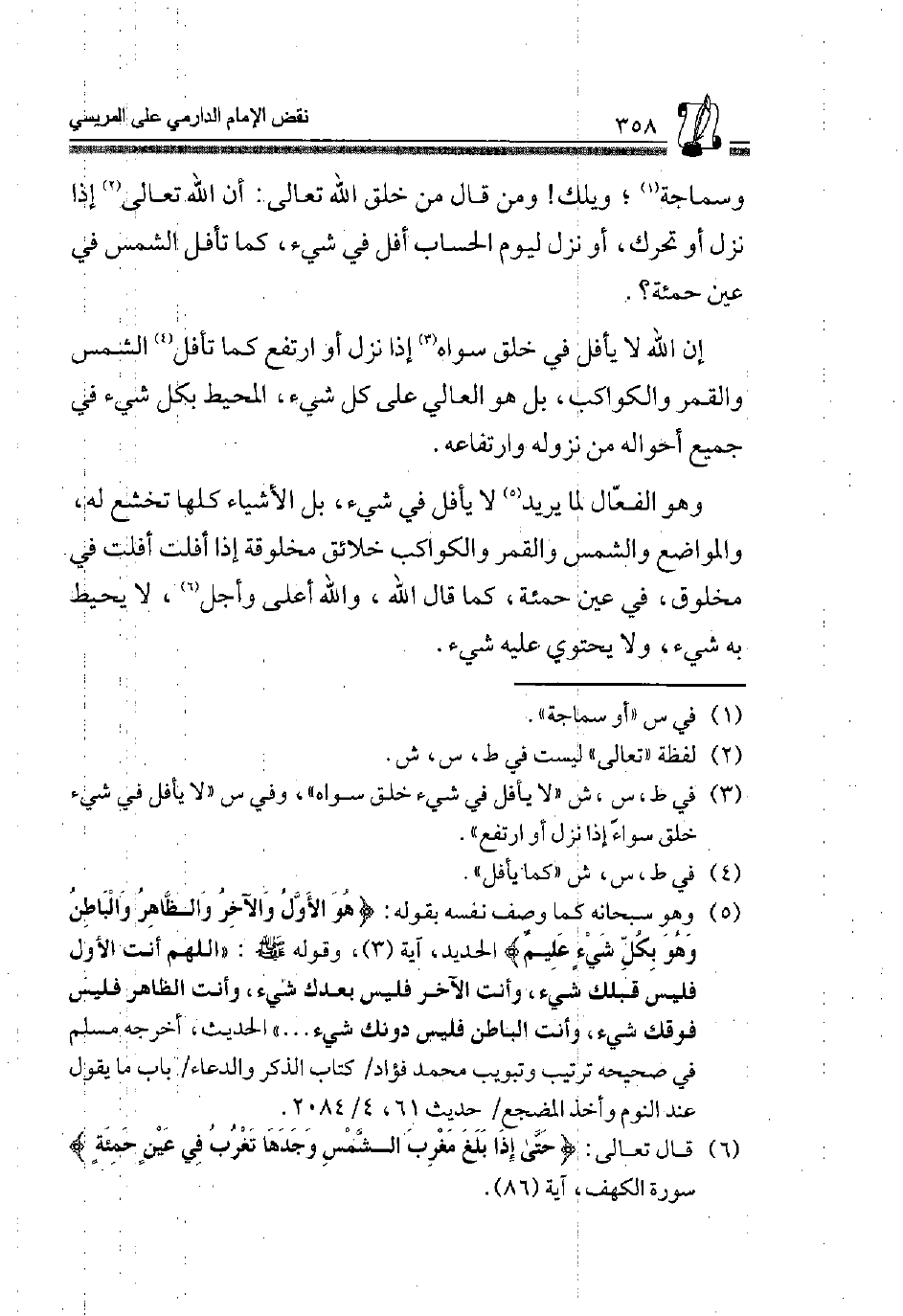 إِن الله يَأْفُلُ فِي خَلْقٍ سِوَاهُ3 إِذَا نَزَلَ أَوِ ارْتَفَعَ كَمَا تَأْفُلُ4 الشَّمْسُ وَالْقَمَرُ وَالْكَوَاكِبُ، بَلْ هُوَ الْعَالِي عَلَى كُلِّ شَيْءٍ، الْمُحِيطُ بِكُل شَيْء فِي جيمع أَحْوَالِهِ مِنْ نُزُولِهِ وَارْتِفَاعِهِ.