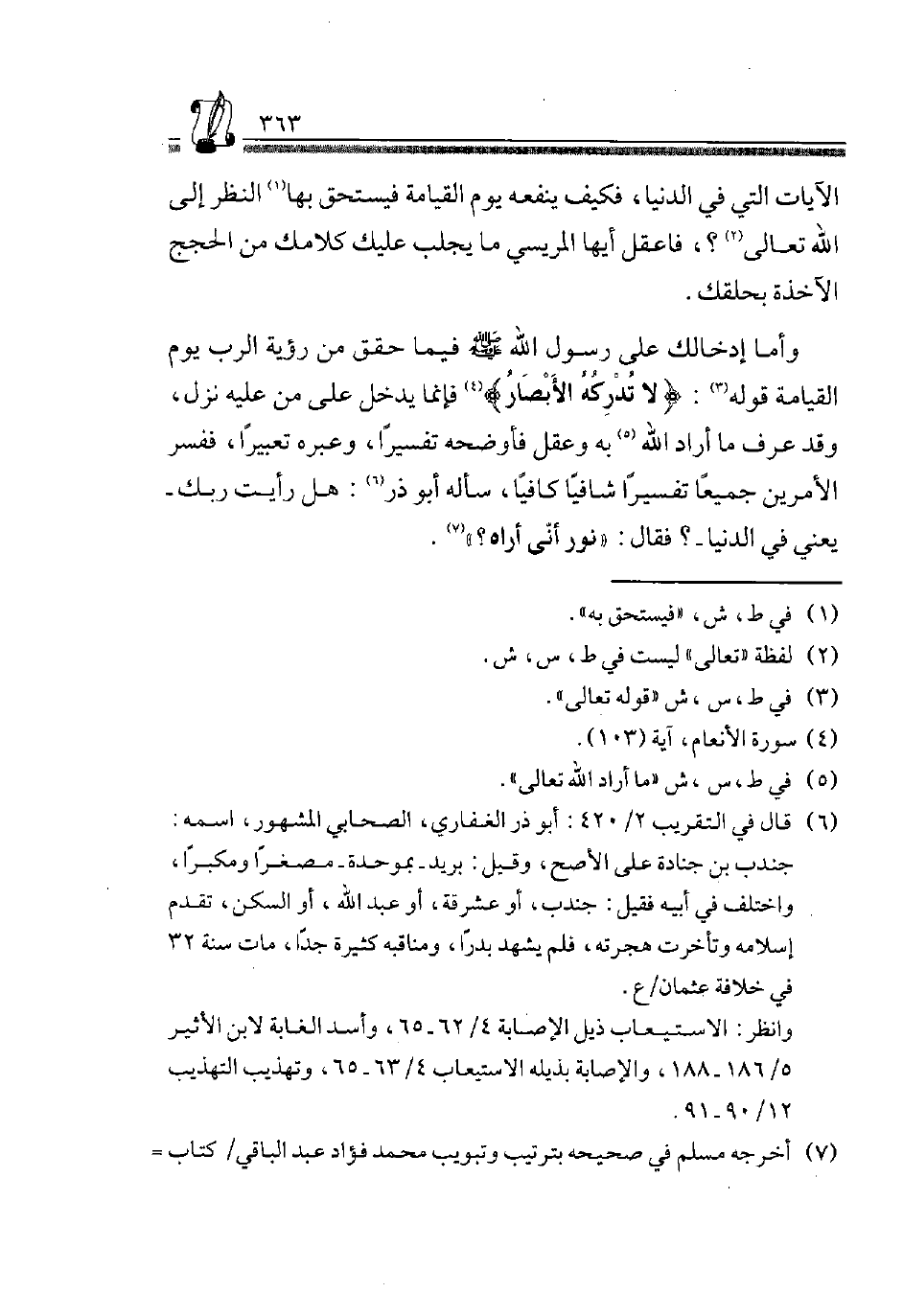 وَأَمَّا إِدْخَالُكَ عَلَى رَسُولِ اللَّهِ صَلَّى اللَّهُ عَلَيْهِ وَسَلَّمَ، فِيمَا حَقَّقَ مِنْ رُؤْيَةِ الرَّبِّ يَوْمَ الْقِيَامَةِ قَوْلَهُ3 {لَا تُدْرِكُهُ الْأَبْصَارُ} 4 فَإِنَّمَا يَدْخُلُ عَلَى مَنْ عَلَيْهِ نَزَلَ، وَقَدْ عَرَفَ مَا أَرَادَ اللَّهُ5 بِهِ وَعَقِلَ فَأْوَضَحَهُ تَفْسِيرًا، وَعَبَّرَهُ تَعْبِيرًا فَفَسَّرَ الْأَمْرَيْنِ جَمِيعًا تَفْسِيرًا شَافِيًا كَافِيًا، سَأَلَهُ أَبُو ذَرٍّ6: هَلْ رَأَيْتَ رَبَّكَ -يَعْنِي فِي الدُّنْيَا-؟ فَقَالَ: "نُورٌ أَنَّى أرَاهُ؟ " 7.