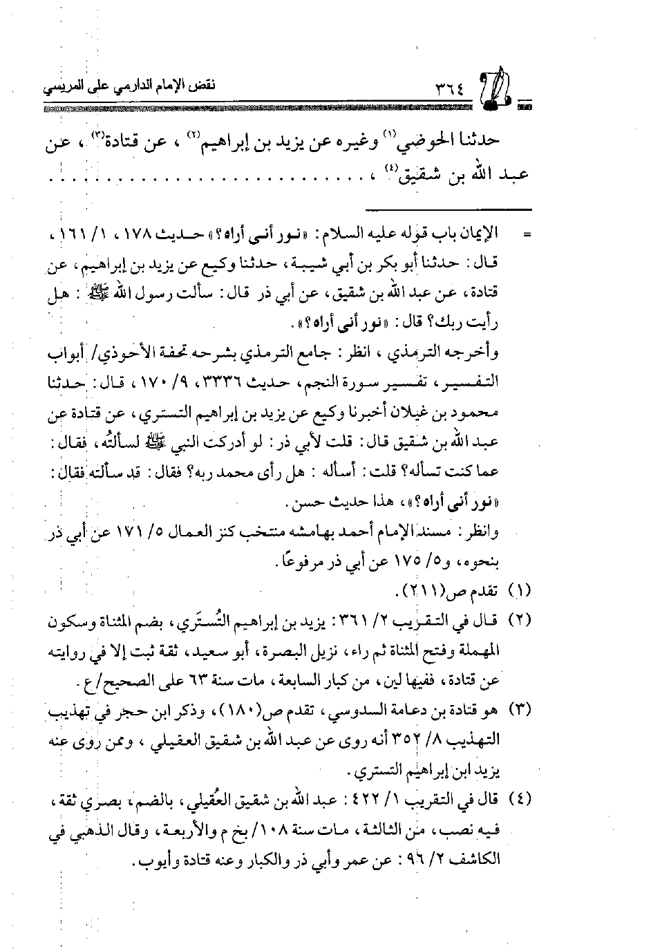 = الْإِيمَان بَاب قَوْله عَلَيْهِ السَّلَام: "نور أَنى أرَاهُ"؟ حَدِيث 178، 1/ 161 قَالَ: حَدَّثَنَا أَبُو بَكْرِ بْنُ أَبِي شيبَة، حَدثنَا وَكِيع، عَنْ يَزِيدَ بْنِ إِبْرَاهِيمَ، عَنْ قَتَادَةَ، عَنْ عَبْدِ اللَّهِ بْنِ شَقِيق، عَن أبي ذَر قَالَ: سَأَلَتْ رَسُولَ اللَّهِ صَلَّى اللَّهُ عَلَيْهِ وَسَلَّمَ: هَلْ رَأَيْتَ رَبَّكَ؟ "نور أَنى أرَاهُ؟ ".