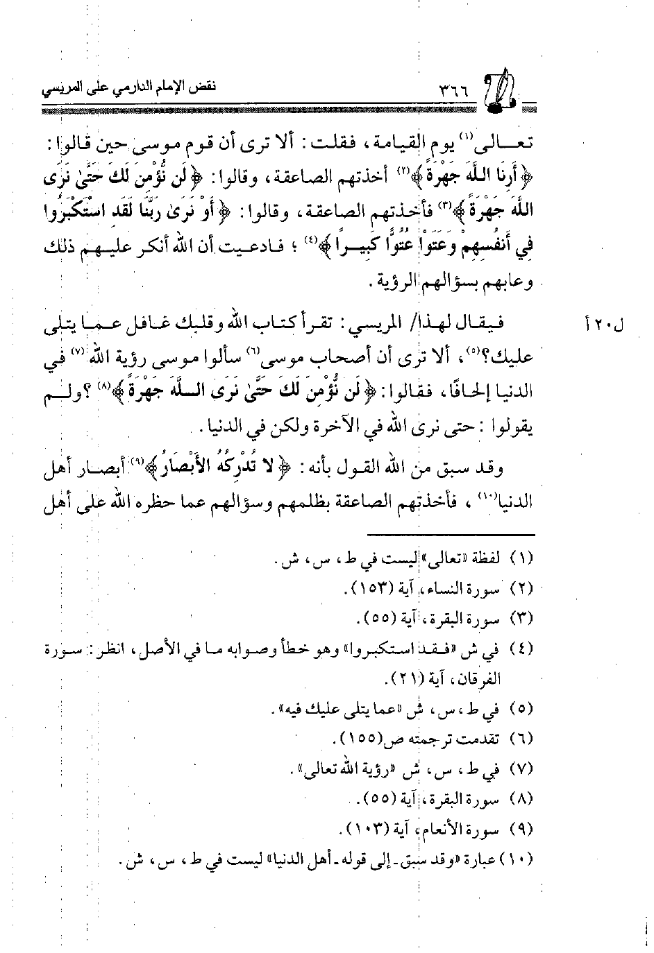 فَيُقَالَ لِهَذَا، الْمَرِيسِيِّ: تَقْرَأُ كِتَابَ اللَّهِ وَقَلْبُكَ غَافِلٌ عَمَّا يُتْلَى عَلَيْكَ؟ 5 أَلَا تَرَى أَنَّ أَصْحَابَ مُوسَى6 سَأَلُوا مُوسَى رُؤْيَةَ اللَّهِ7 فِي الدُّنْيَا إِلْحَافًا، فَقَالُوا: {لَنْ نُؤْمِنَ لَكَ حَتَّى نَرَى اللَّهَ جَهْرَةً} 8؟ وَلَو يَقُولُوا: حَتَّى نَرَى اللَّهَ فِي الْآخِرَةِ وَلَكِنْ فِي الدُّنْيَا.