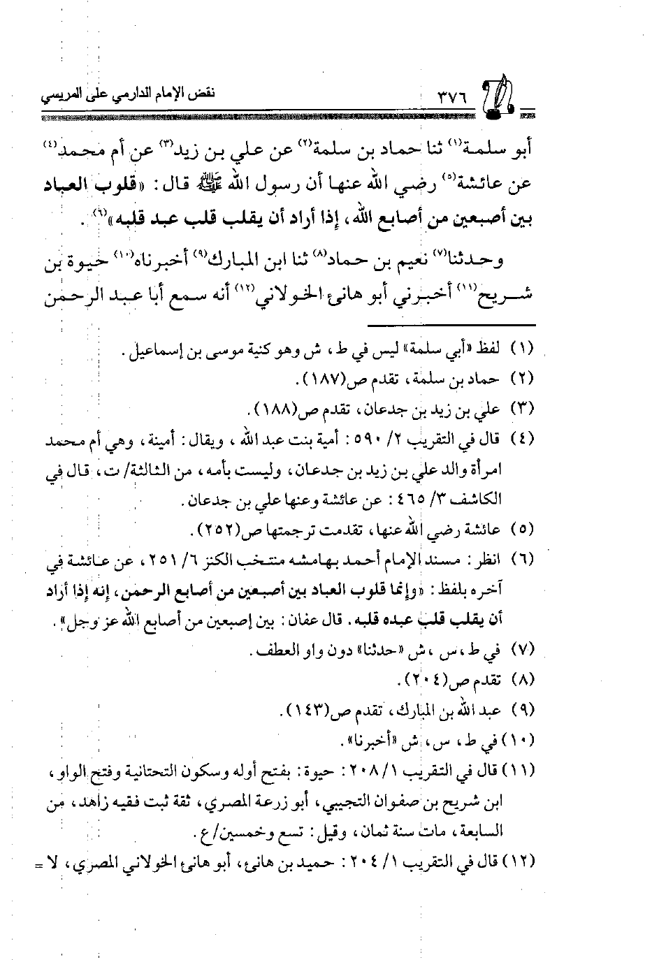 6 انْظُر: مُسْند الإِمَام أَحْمد بهامشه منتخب الْكَنْز 6/ 251، عَن عَائِشَة فِي آخِره بِلَفْظ "وَإِنَّمَا قُلُوبُ الْعِبَادِ بَيْنَ أُصْبُعَيْنِ مِنْ أَصَابِع الرَّحْمَن، إِنَّه إِذَا أَرَادَ أَنْ يُقَلِّبَ قَلْبَ عبد قلبه. قَالَ عَفَّان: بَيْنَ أُصْبُعَيْنِ مِنْ أَصَابِعِ اللَّهِ عز وَجل.