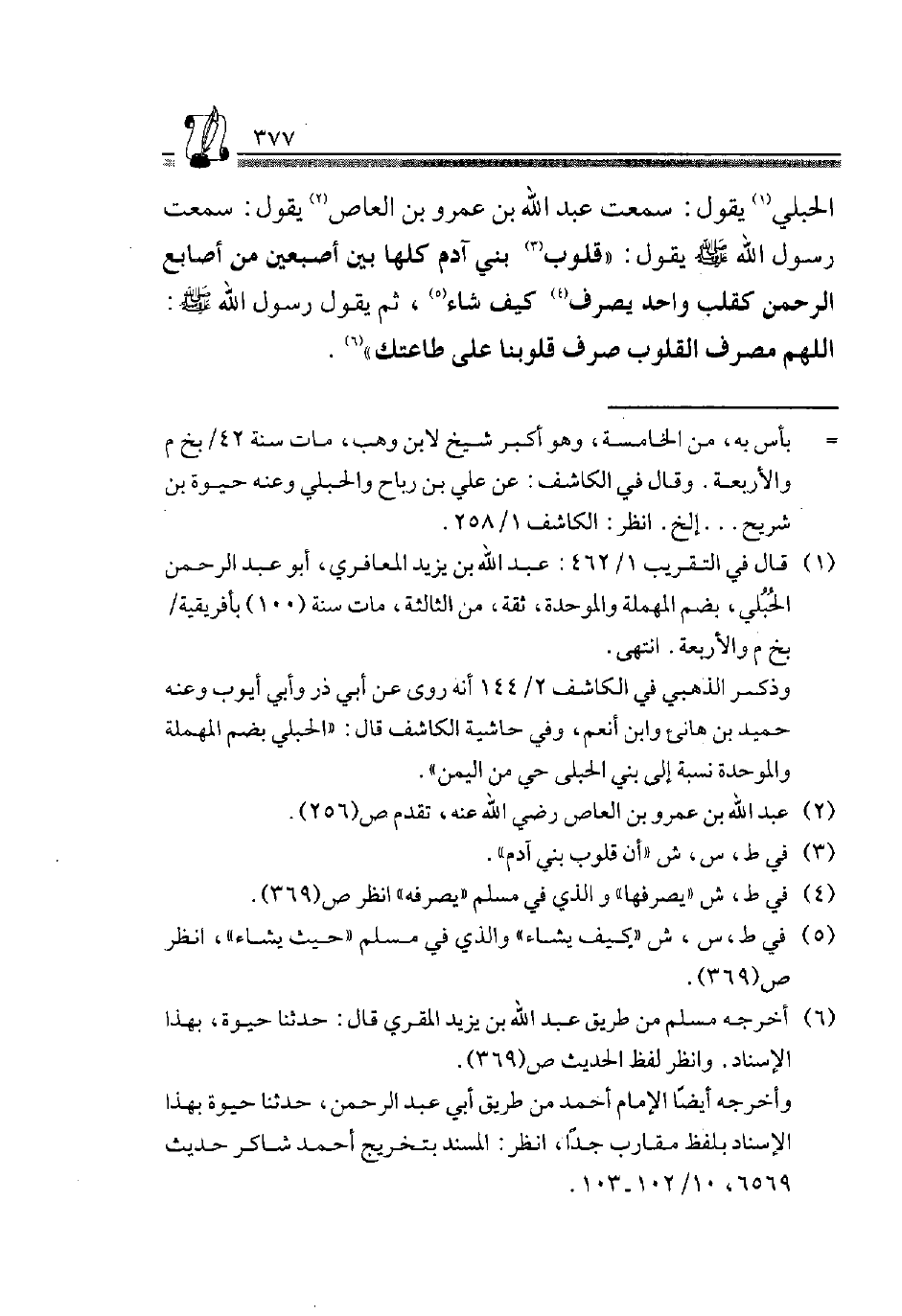 الْحُبُلِّيَّ1 يَقُولُ: سَمِعْتُ عَبْدَ اللَّهِ بْنَ عَمْرِو بْنِ الْعَاصِ2 يَقُولُ: سَمِعْتُ رَسُولَ اللَّهِ صَلَّى اللَّهُ عَلَيْهِ وَسَلَّمَ يَقُولُ: "قُلُوبُ 3 بَنِي آدَمَ كُلُّهَا بَيْنَ أُصْبُعَيْنِ مِنْ أَصَابِع الرَّحْمَن كقلب وَاحِد يصرف 4 كَيفَ شَاءَ 5 ثُمَّ يَقُولُ رَسُولُ اللَّهِ صَلَّى اللَّهُ عَلَيْهِ وَسَلَّمَ: اللَّهُمَّ مُصَرِّفَ الْقُلُوبِ صَرِّفْ قُلُوبَنَا عَلَى طَاعَتِكَ" 6.