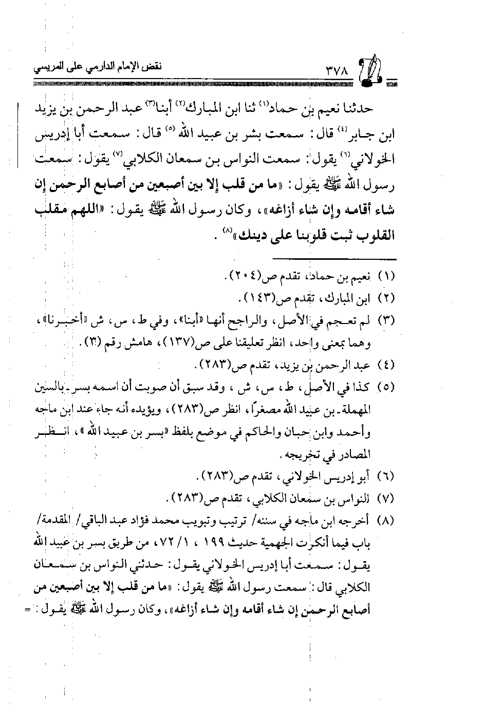 حَدَّثَنَا نُعَيْمُ بْنُ حَمَّادٍ1، ثَنَا ابْن الْمُبَارك2 أبنا3 عَبْدُ الرَّحْمَنِ بْنُ يَزِيدَ بْنِ جَابِرٍ4 قَالَ: سَمِعْتُ بِشْرَ بْنَ عَبْدِ اللَّهِ5 قَالَ: سَمِعْتُ أَبَا إِدْرِيسَ الْخَوْلَانِيَّ6 يَقُولُ: سَمِعْتُ النُّوَاسَ بْنَ سَمْعَانَ الْكِلَابِيَّ7 يَقُولُ: سَمِعْتُ رَسُولِ اللَّهِ صَلَّى اللَّهُ عَلَيْهِ وَسَلَّمَ يَقُولُ: "مَا مِنْ قَلْبٍ إِلَّا بَين أصبيعن مِنْ أَصَابِعِ الرَّحْمَنِ إِنْ شَاءَ أَقَامَهُ وَإِنْ شَاءَ أَزَاغَهُ" وَكَانَ رَسُولِ اللَّهِ صَلَّى اللَّهُ عَلَيْهِ وَسَلَّمَ يَقُولُ: "اللَّهُمَّ مُقَلِّبَ الْقُلُوبِ ثَبت قُلُوبنَا على دينك" 8.